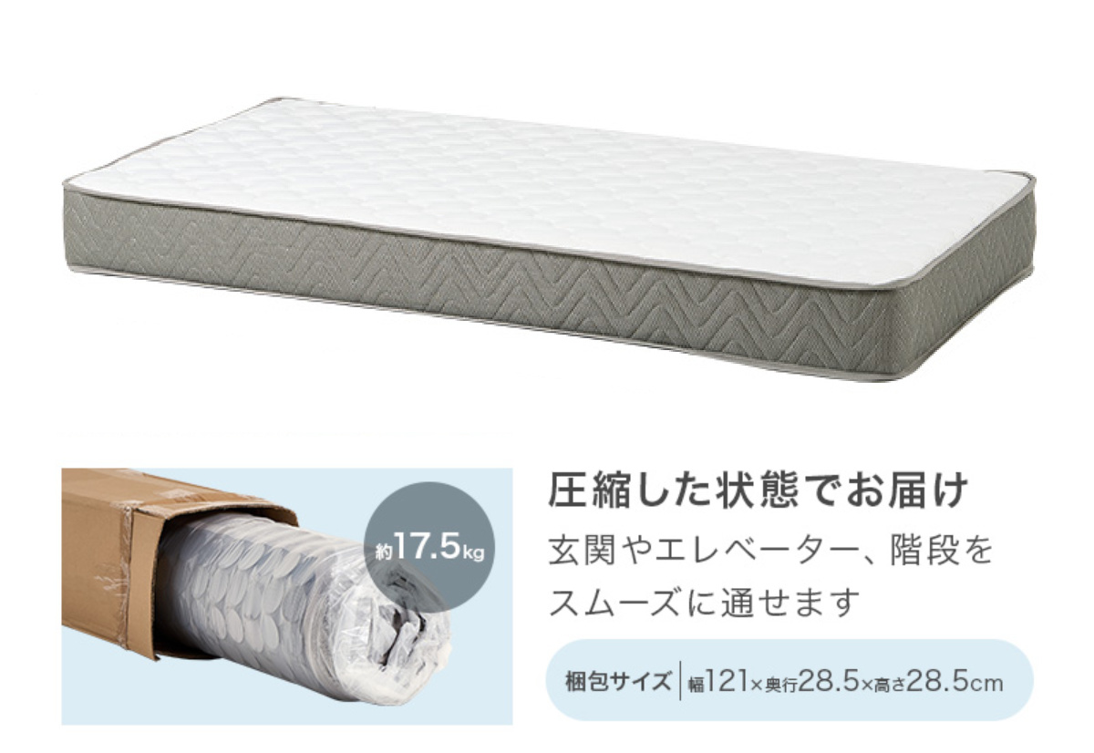 マットレスは、ロール状のコンパクトな圧縮梱包でのお届けです。大きなマットレスはベッドまでの移動が大変ですが、玄関やエレベーター、階段をスムーズに通せます。簡単に、安心して搬入・設置をしていただけます。お部屋のスペースが限られている方にもおすすめです。