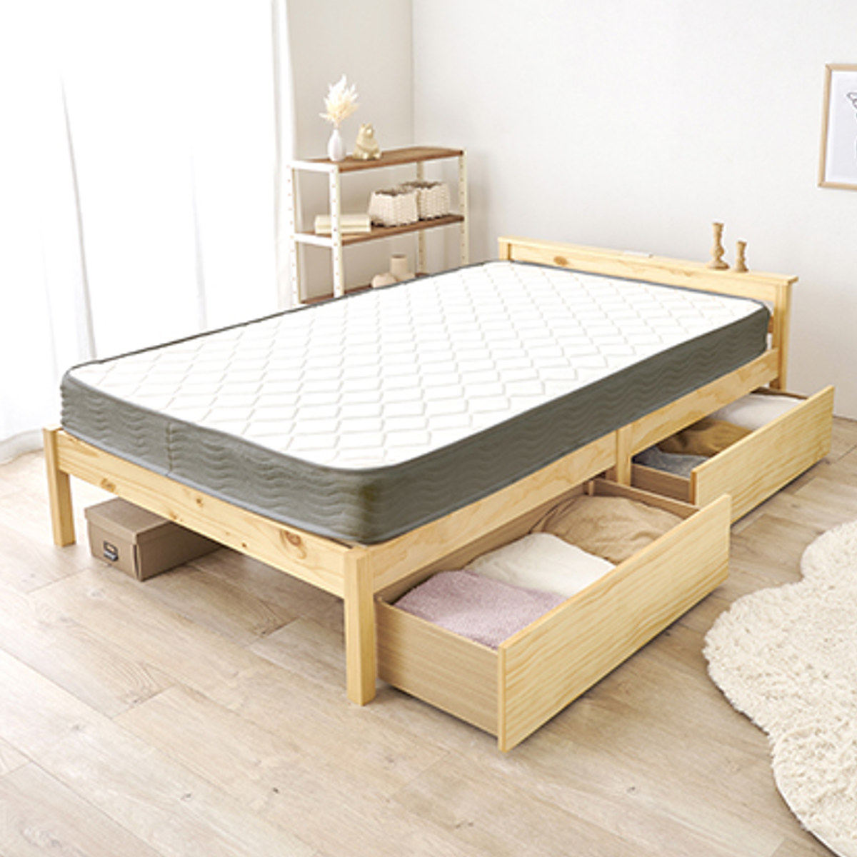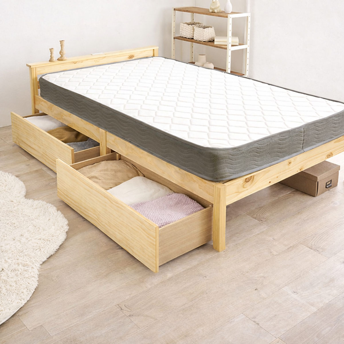 ネジも工具も不要、簡単に組み立てることができるベッドフレームとボンネルコイルマットレスのセットです。パーツを差し込むだけなので、組み立て家具が苦手な方でもたった3分で組み立てることができます。天然木の温もりが感じられる柔らかなパイン材を使用し、美しい木目と経年による色の変化を楽しめます。