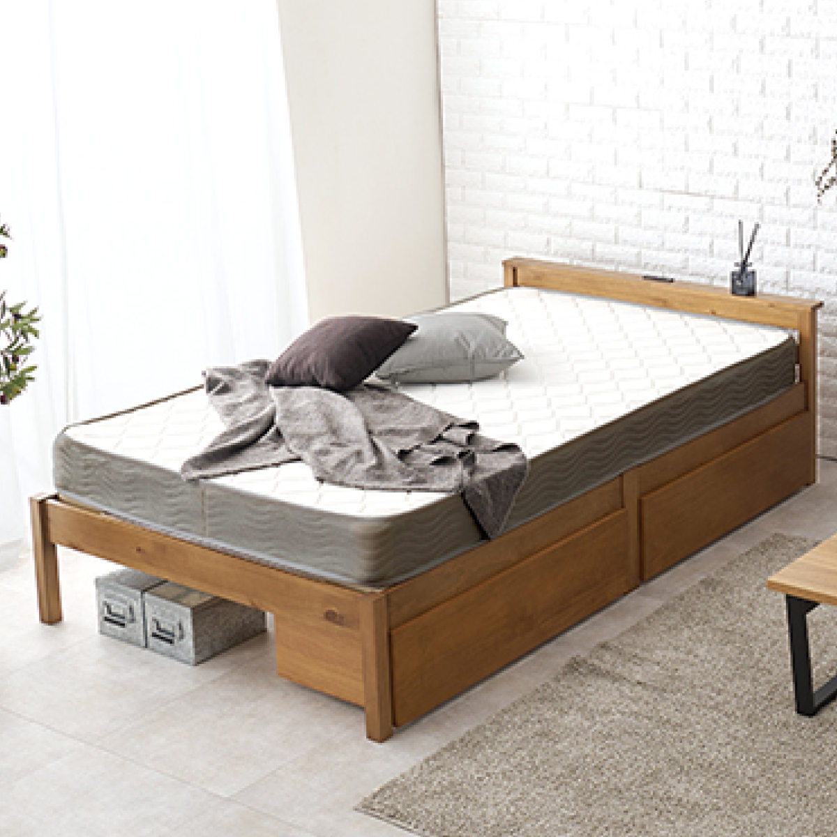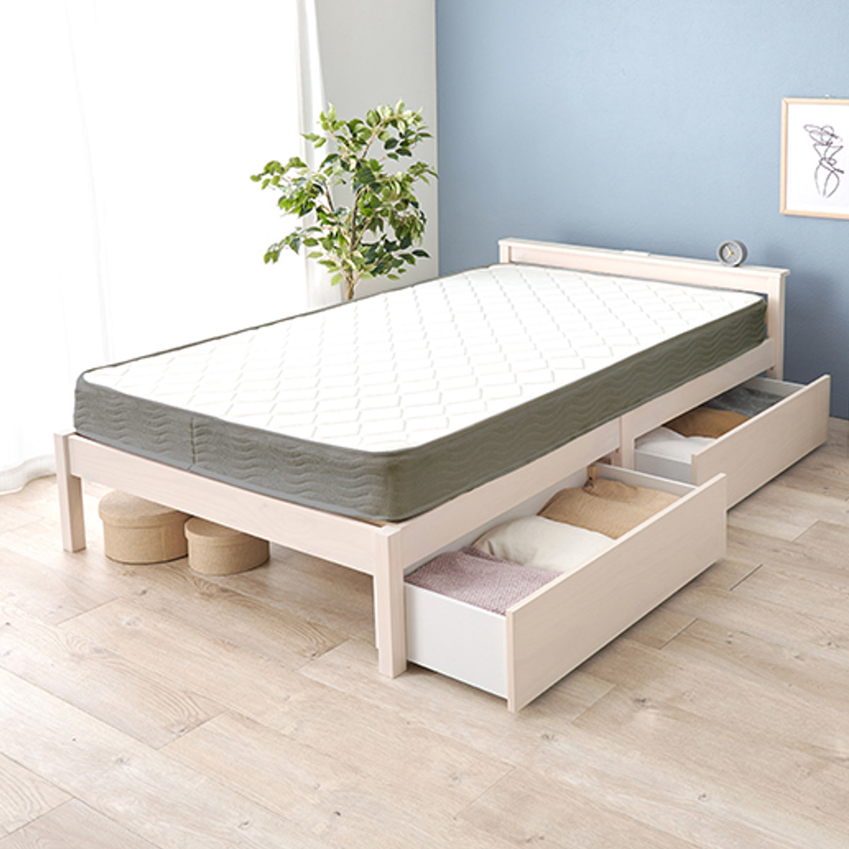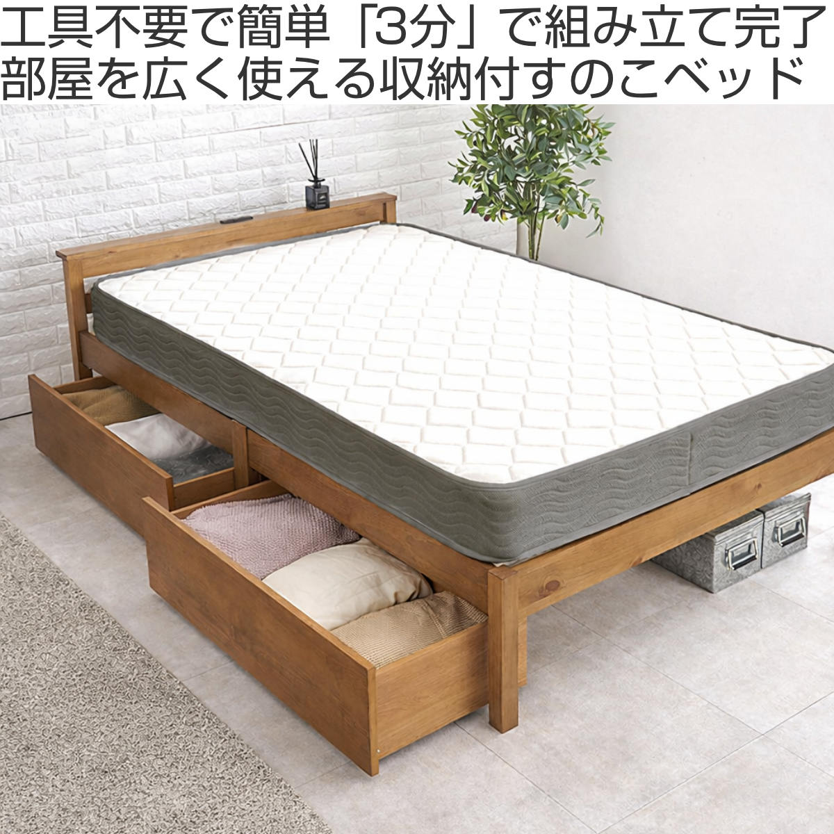 3分組立ベッド セミダブル ボンネルコイルマットレス付 引出し収納 宮棚 2口コンセント ( ベッド 3分組み立て 圧縮梱包 収納付き 工具不要 マットレスセット 耐荷重200kg ライトブラウン ナチュラル ウォッシュホワイト ) 【ウォッシュホワイト】