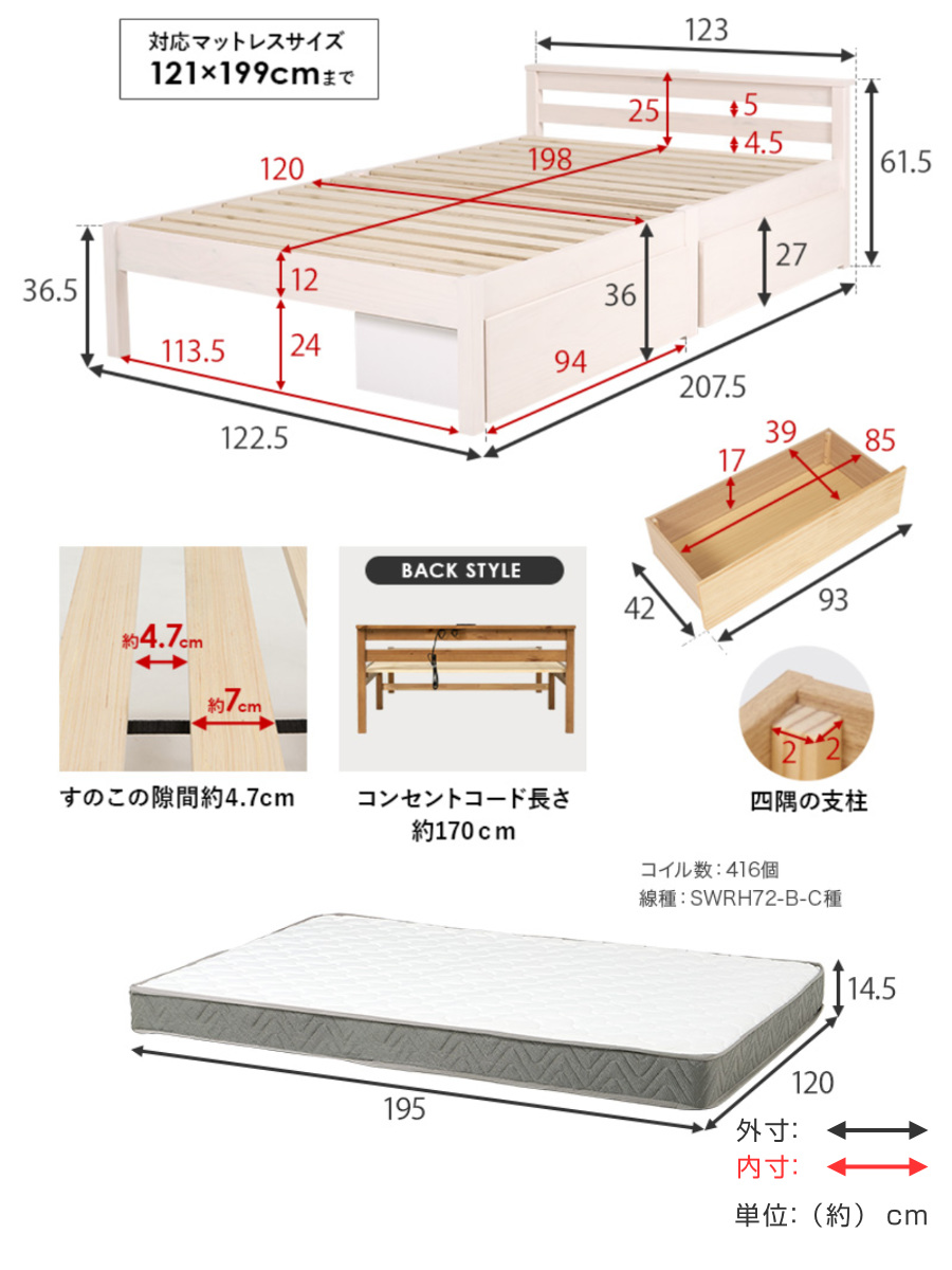 | サイズ | 【ベッド】 約 幅123×奥行207.5×高さ61.5×床面高36.5(cm) 【マットレス】 約 幅120×奥行195×高さ14.5(cm) |