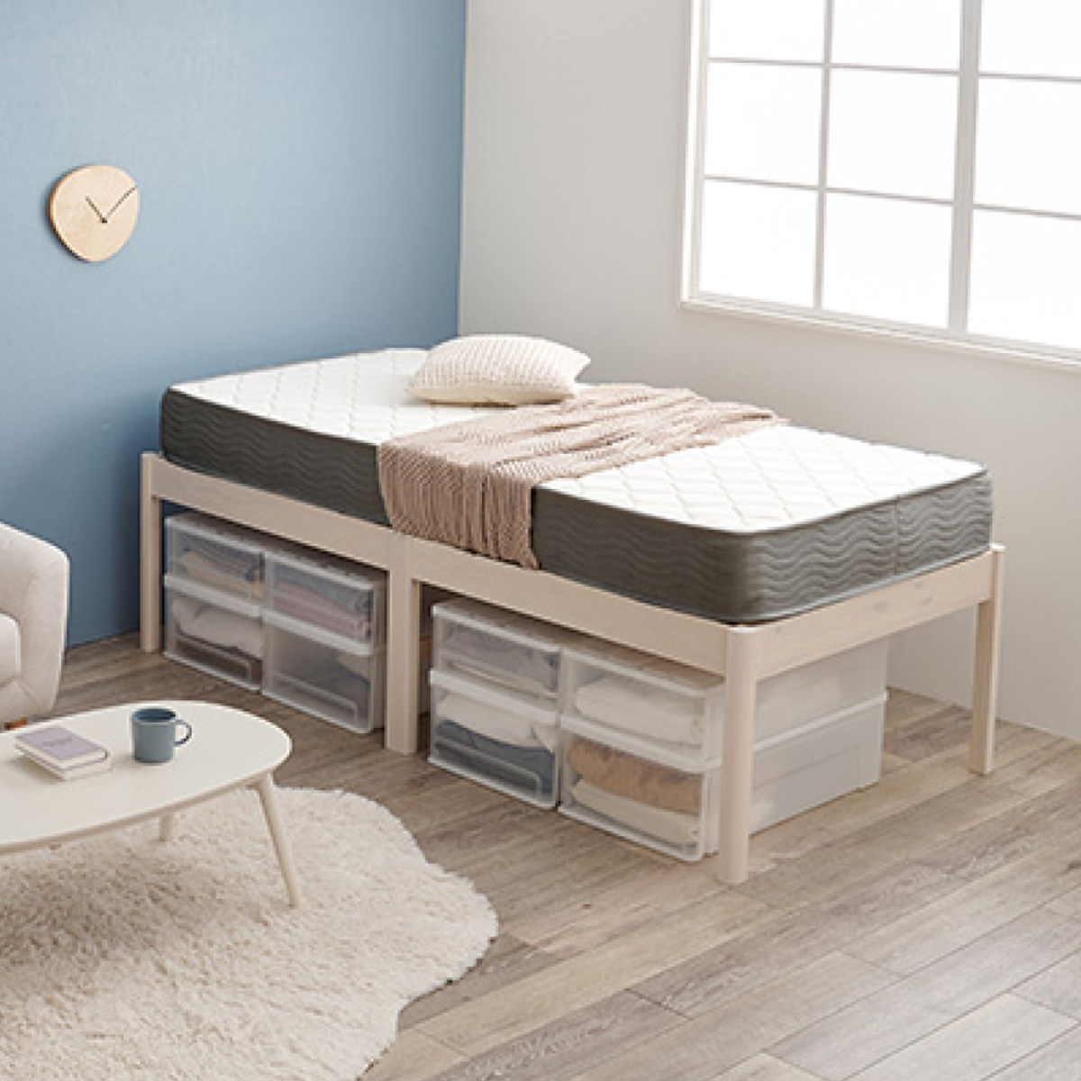 ネジも工具も不要、簡単に組み立てることができるベッドフレームとポケットコイルマットレスのセットです。パーツを差し込むだけなので、組み立て家具が苦手な方でもたった3分で組み立てることができます。天然木の温もりが感じられる柔らかなパイン材を使用し、美しい木目と経年による色の変化を楽しめます。