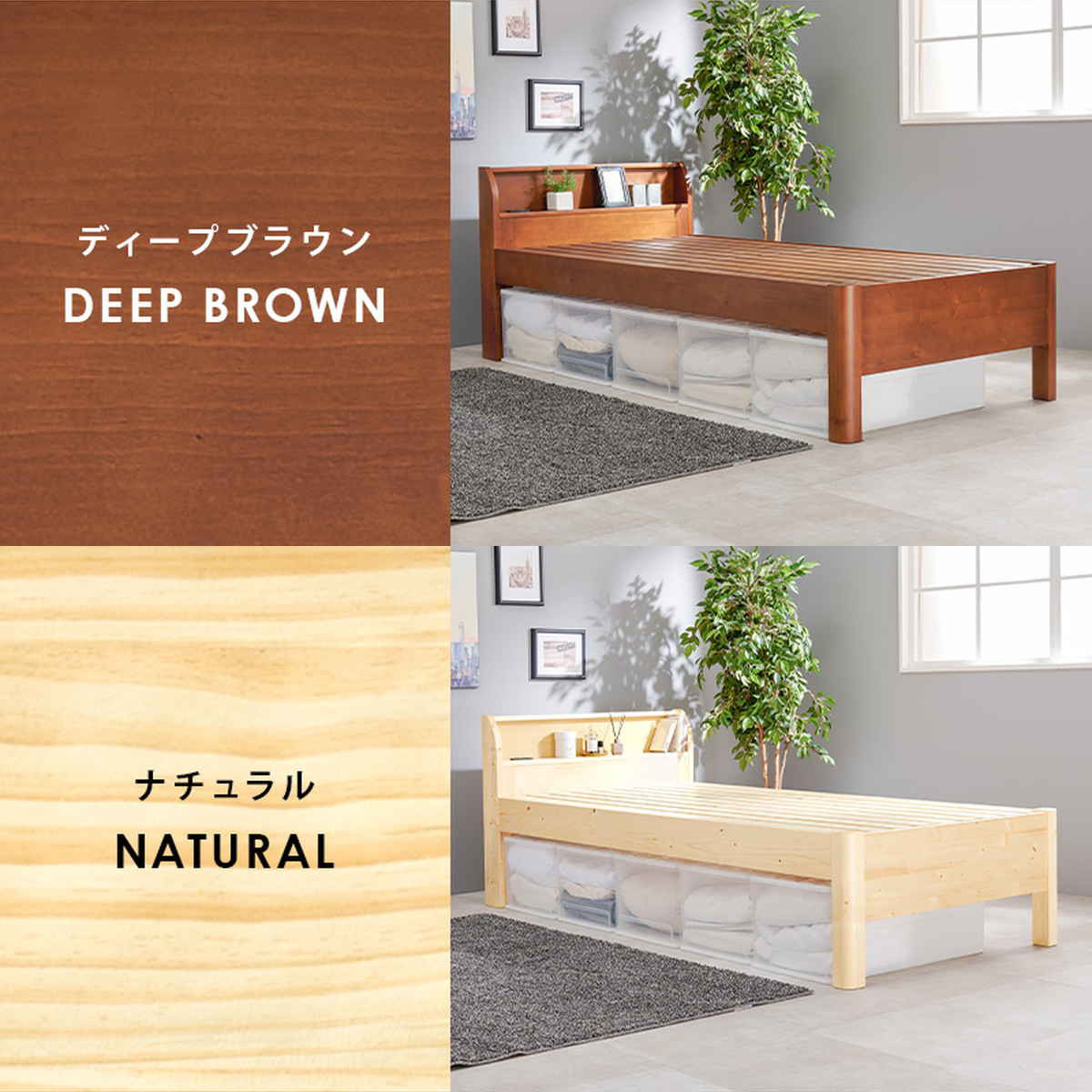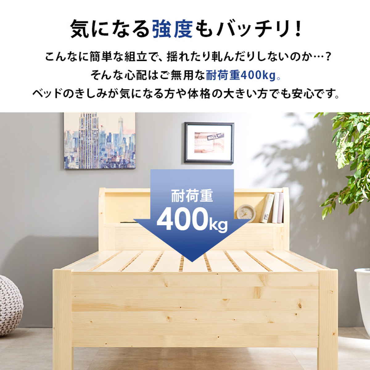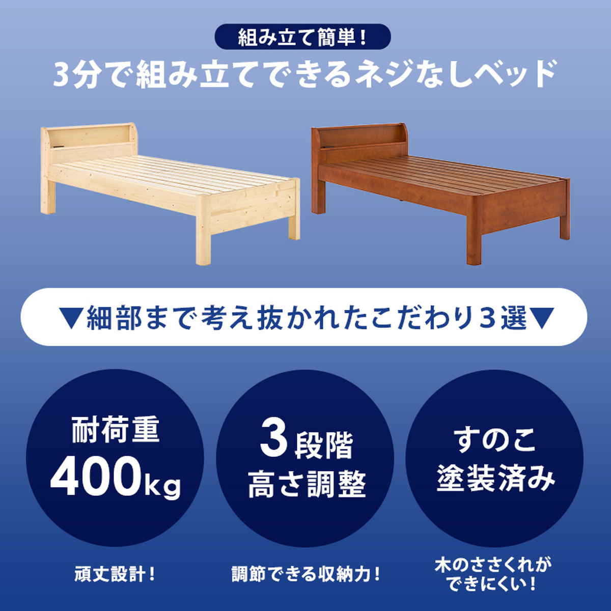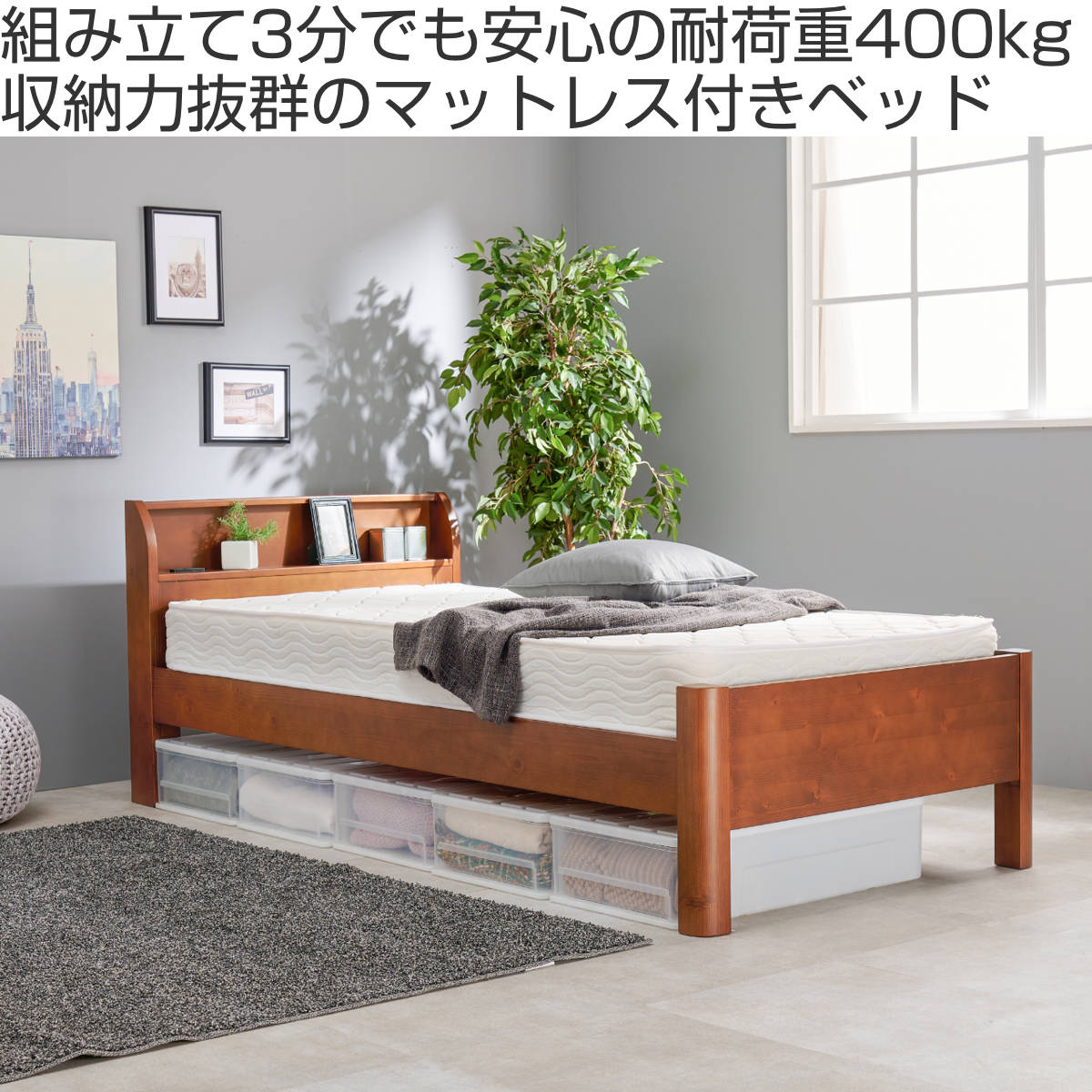 3分組立ベッド シングル ボンネルコイルマットレス付 宮棚 2口コンセント付 高耐荷重 ( ベッド 3分組み立て 組み立て簡単 圧縮梱包 棚付き 工具不要 マットレスセット 耐荷重400kg 天然木 ディープブラウン ナチュラル ) 【ナチュラル】