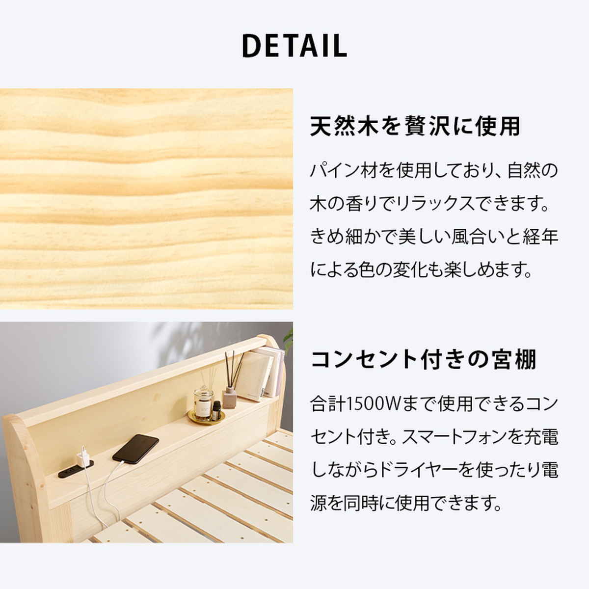 眼鏡や目覚まし時計などの小物を置くことができる宮棚付きです。棚には2口コンセントが付いているので、枕元でライトを灯しながら同時にスマホやタブレットを充電することができます。