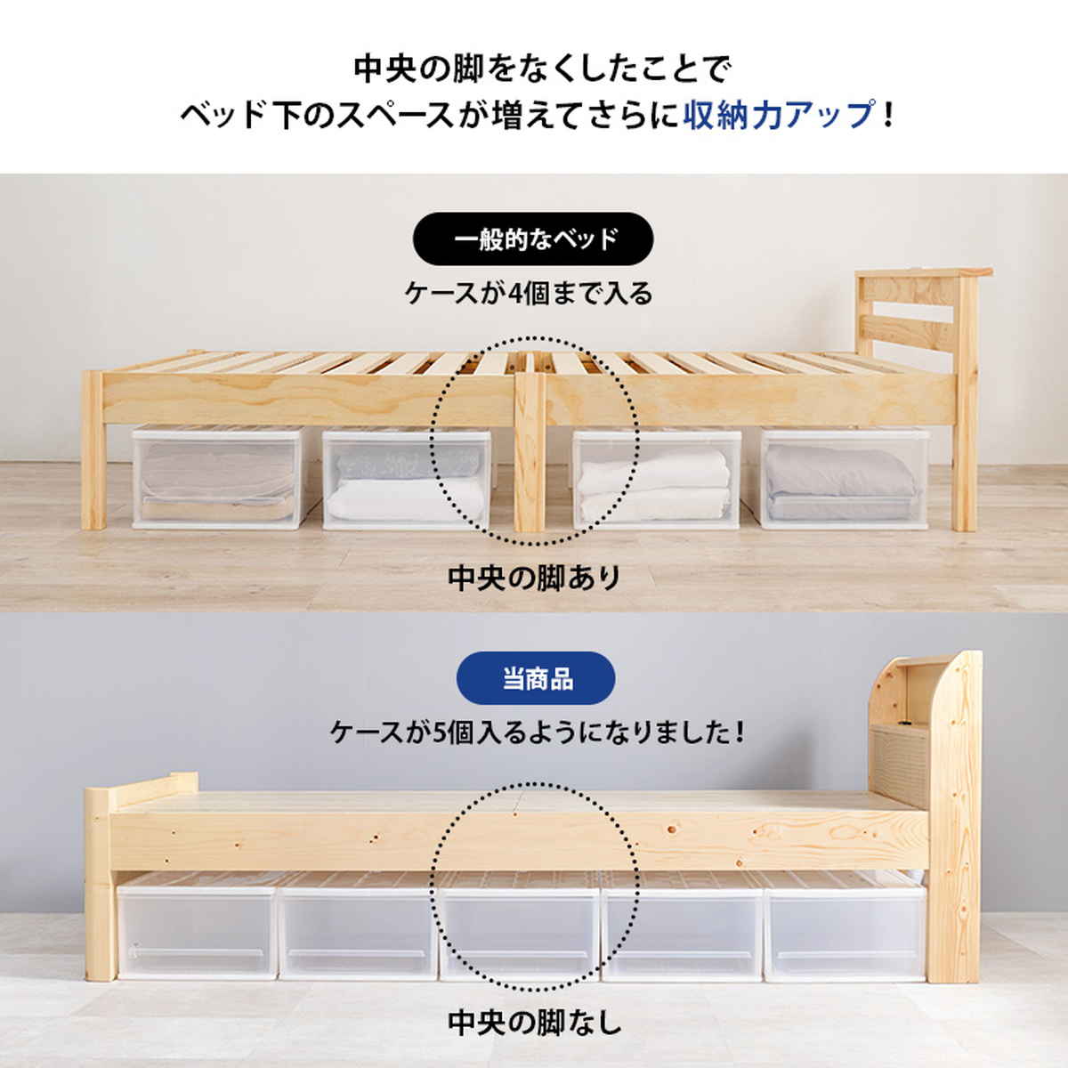 中央の脚をなくしたことで、ベッド下に長めのラグが収納できるようになりました。大型のキャリーバッグや収納ケースなど、かさばる物もたっぷりと収納できます。収納ケースは横に並べて隙間なく収納できるので、お部屋がスッキリと片付きます。