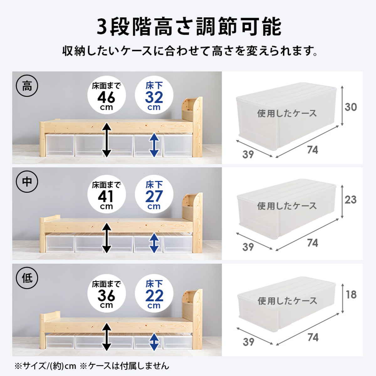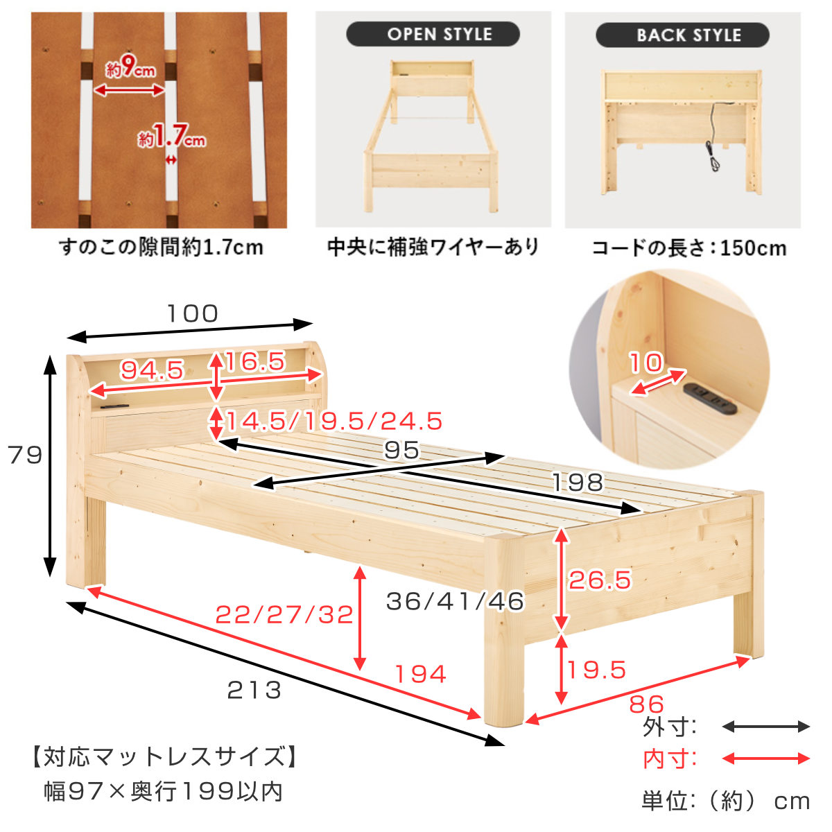 | サイズ | ベッド:約 幅100×奥行213×高さ79(cm) マットレス:約 幅97×奥行195×高さ14.5(cm) 床面高:36・41・46(cm)の3段階 |