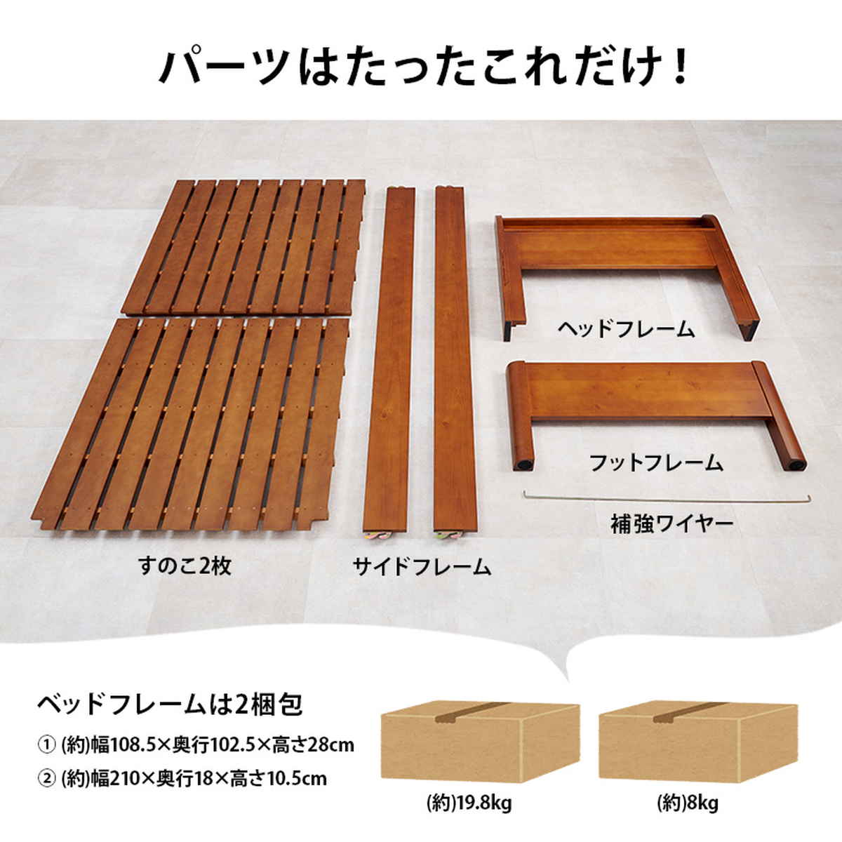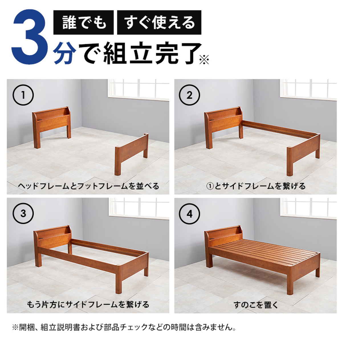 たったの3分で簡単に組み立てられるベッドフレームです。パーツを差し込むだけなので、組み立て作業が苦手な方でもスムーズに完成します。天然木の温もりが感じられるパイン材を使用し、美しい木目や経年による色の変化も楽しめます。
