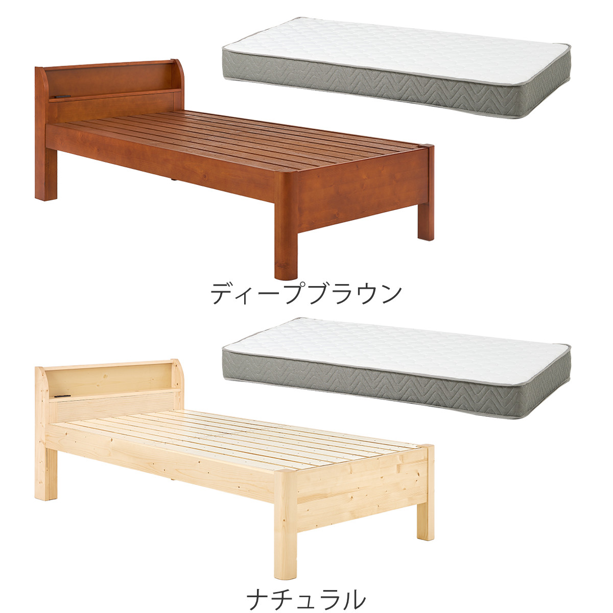 3分組立ベッド シングル ポケットコイルマットレス付 宮棚 2口コンセント付 高耐荷重 ( ベッド 3分組み立て 組み立て簡単 圧縮梱包 棚付き 工具不要 マットレスセット 耐荷重400kg 天然木 ディープブラウン ナチュラル ) 【ナチュラル】