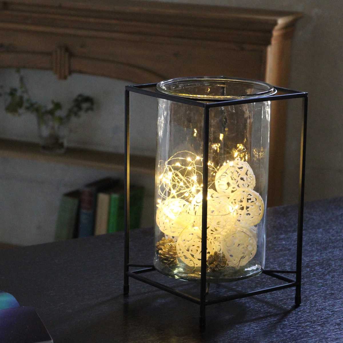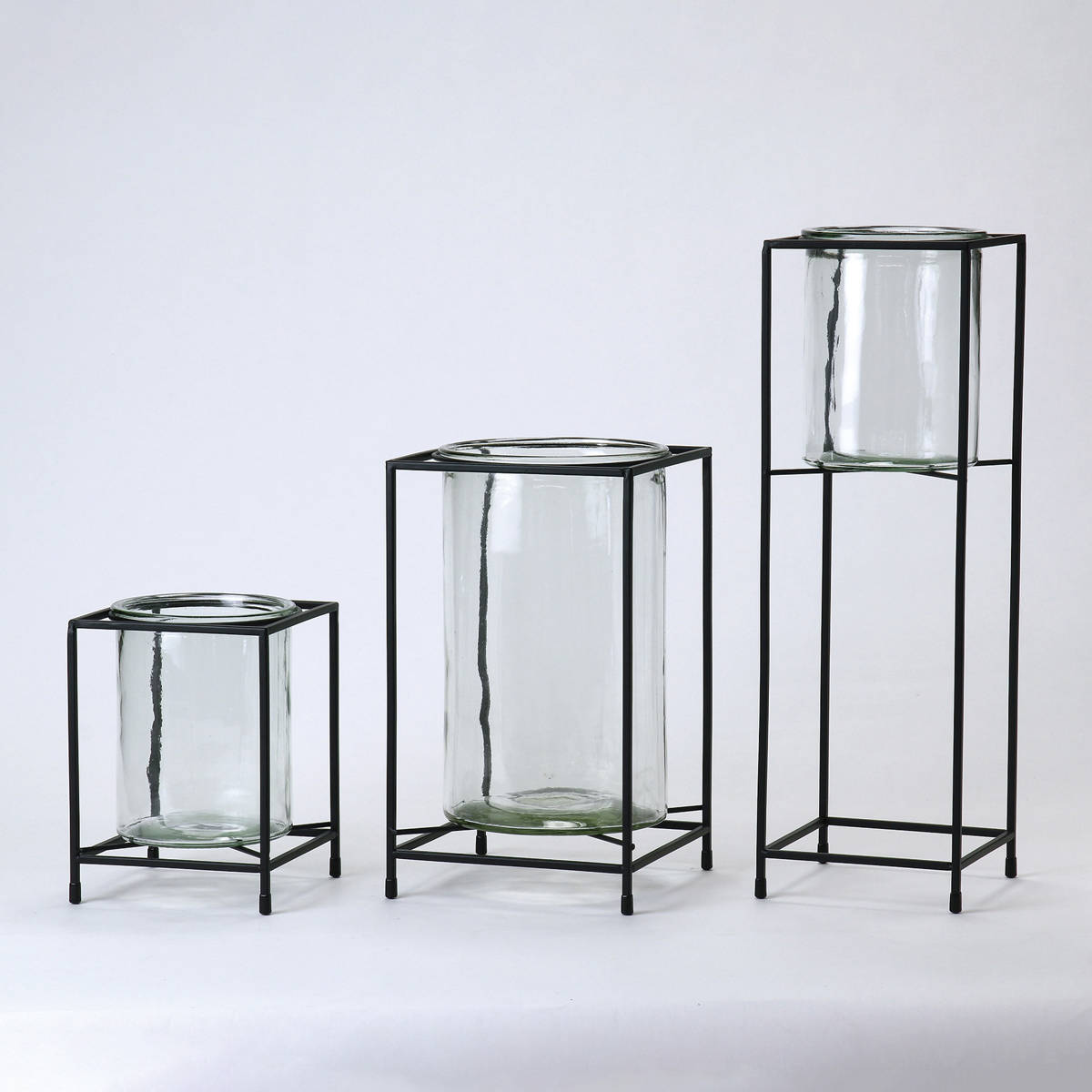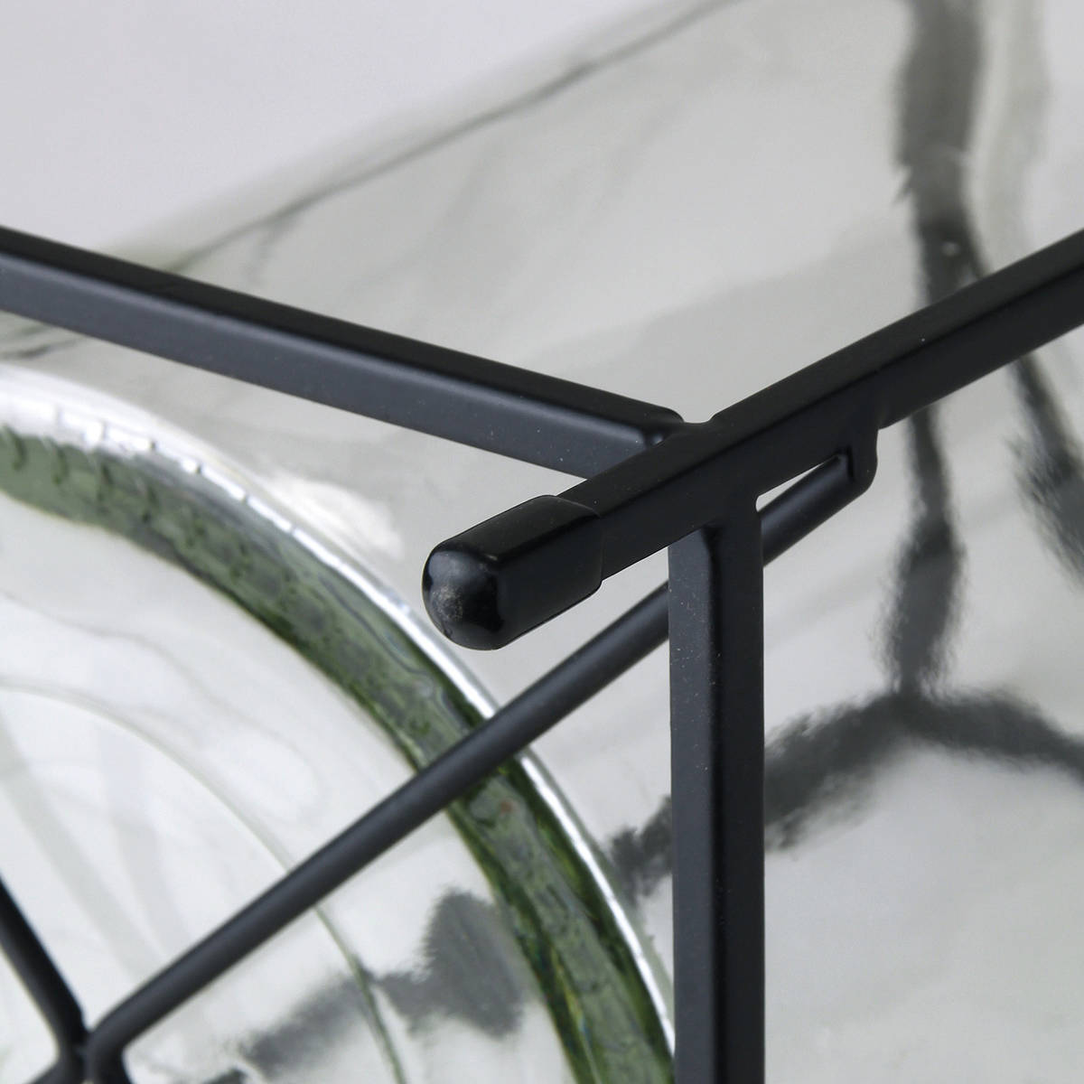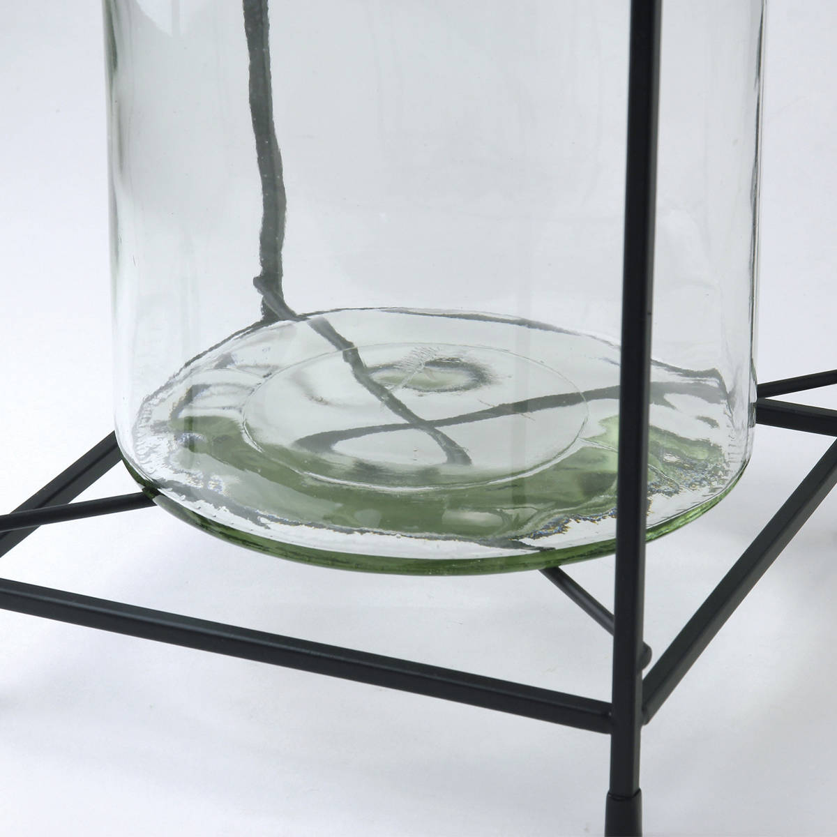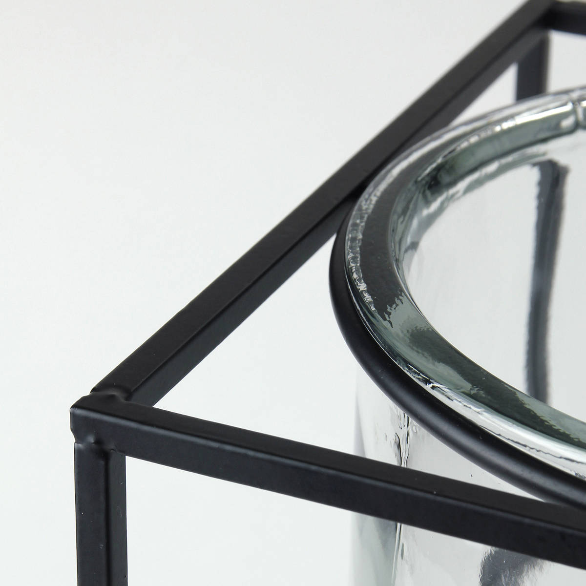 ガラスベースの中にキャンドルやライトを入れることで、やわらかな灯りを楽しめるデザイン。アイアンフレームが光を引き立て、空間に落ち着いた雰囲気を演出します。玄関やリビングに置くだけで、心地よいあたたかさをプラスしてくれます。