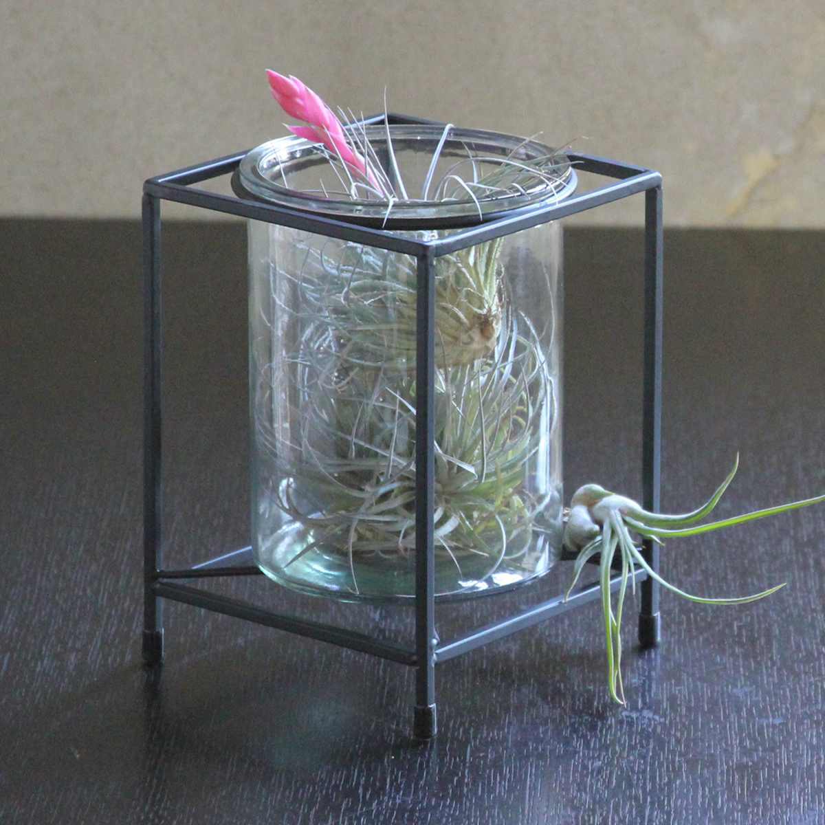 ガラスベースにエアプランツを飾って、清潔感のあるグリーンディスプレイに。中の様子が見えることで、軽やかで抜け感のある印象を楽しめます。アイアンフレームと組み合わせることで、洗練された雰囲気に仕上がります。