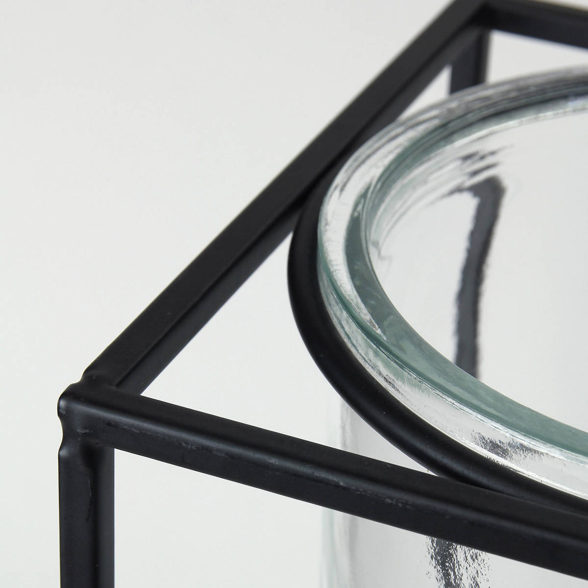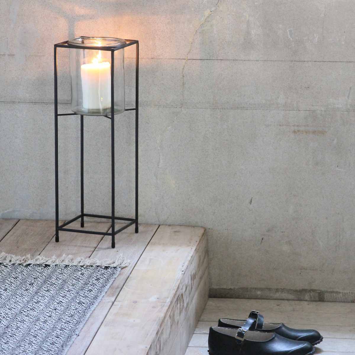 ガラスベースの中にキャンドルやライトを入れることで、やわらかな灯りを楽しめるデザイン。アイアンフレームが光を引き立て、空間に落ち着いた雰囲気を演出します。玄関やリビングに置くだけで、心地よいあたたかさをプラスしてくれます。