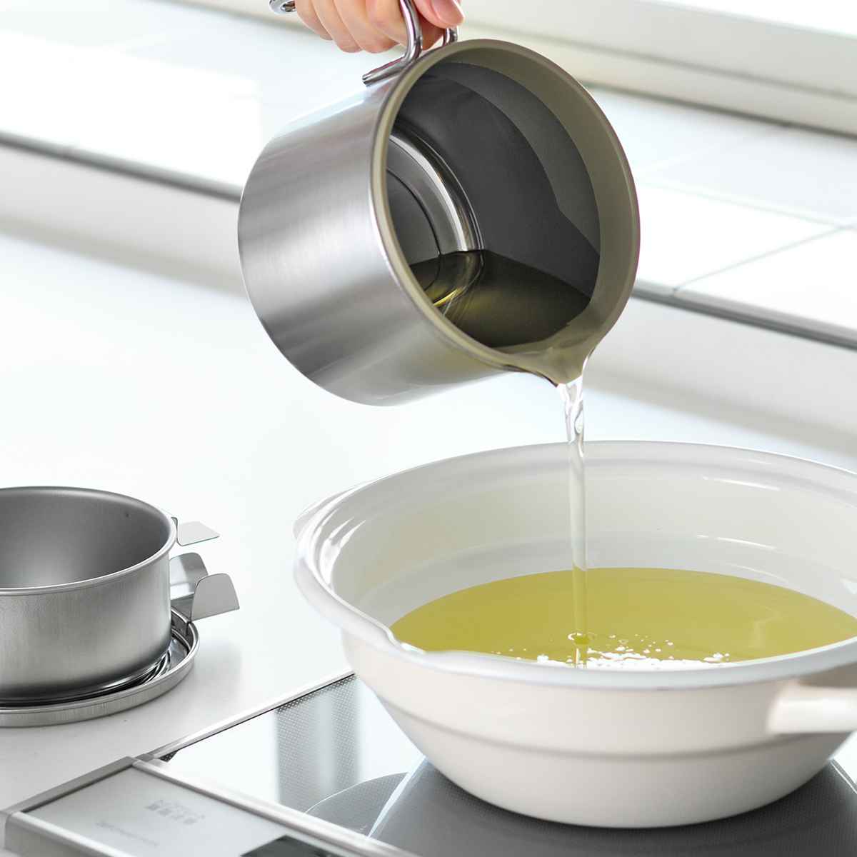 注ぎ口は伝い漏れしにくい二重構造で、液だれによるベタつきや収納スペースの汚れを防ぎます。ホコリの侵入を防ぐフタ付きで、油を清潔に保管できます。