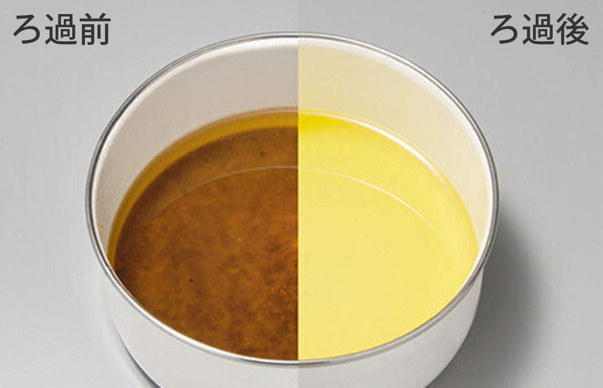 ろ過パウダーが油の酸化劣化物を吸着除去するので、揚げカスを取り除くだけでなく油自体がキレイになります。