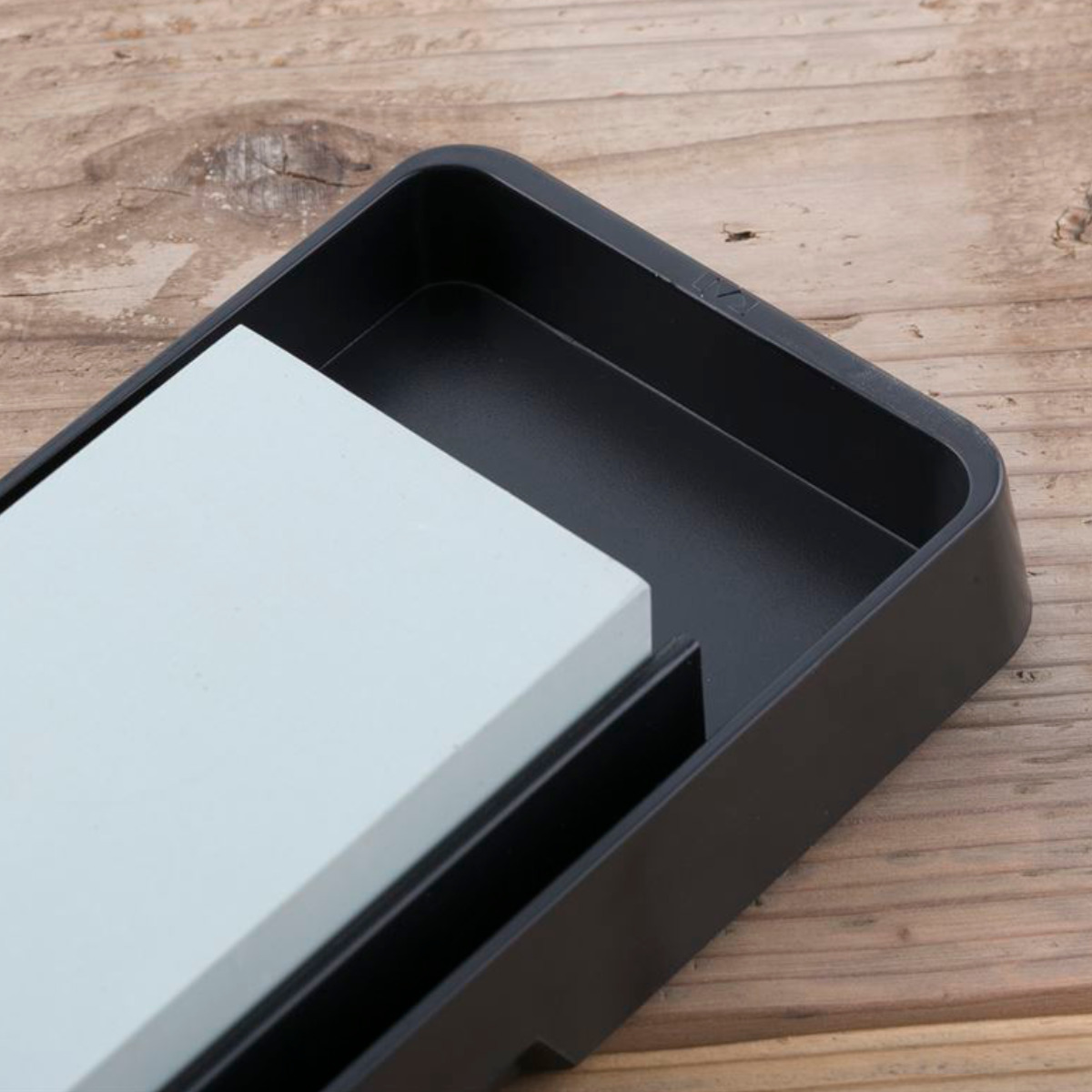 受け皿の裏面には合成ゴムのリブを採用し、すべりにくく安定した作業が可能です。砥石上の水(とぎ汁)を受ける溝付きで、キッチンを汚しにくいです。