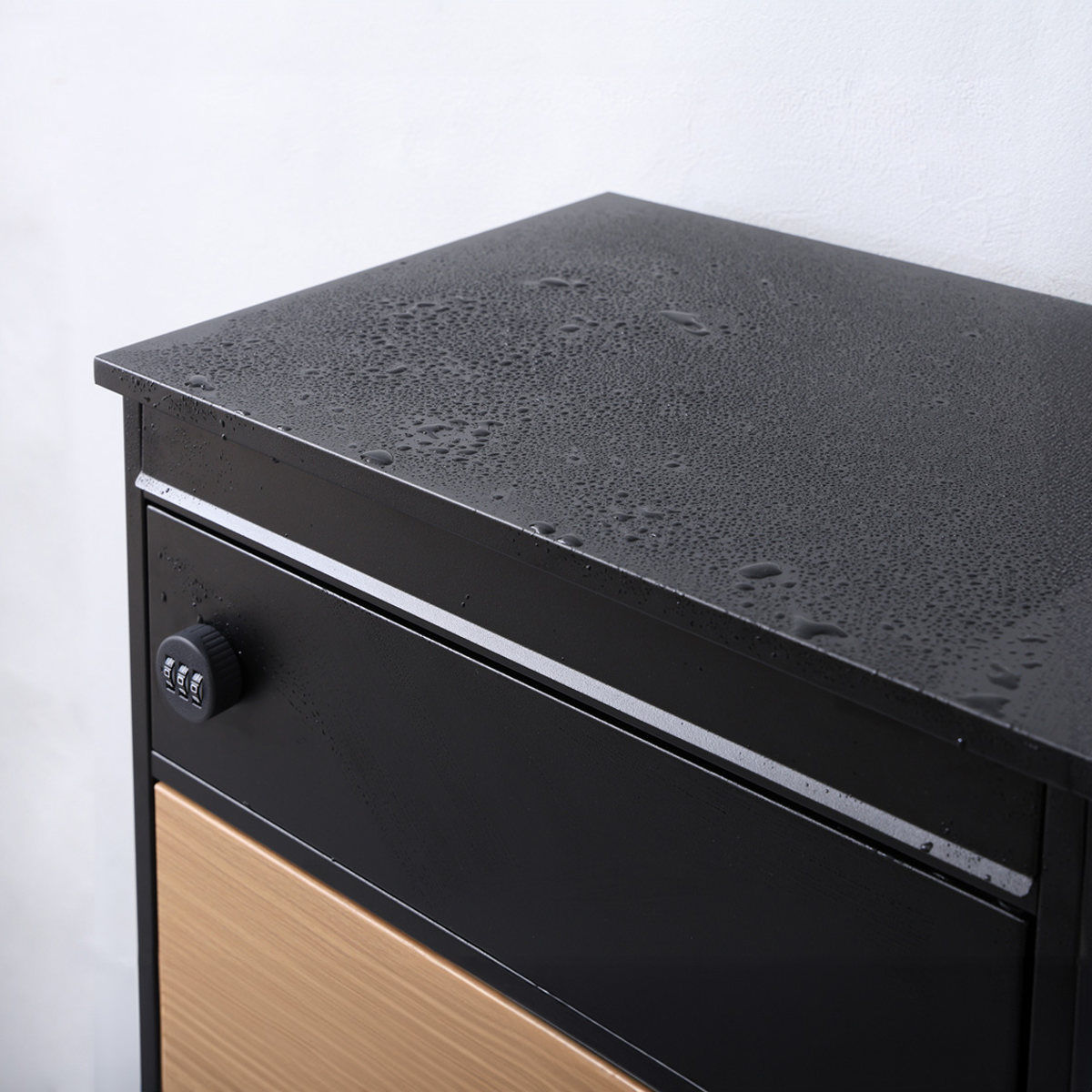引き締まった黒のフレームがスタイリッシュな印象の宅配ボックスです。扉のオーク柄が美しいアクセントになっています。