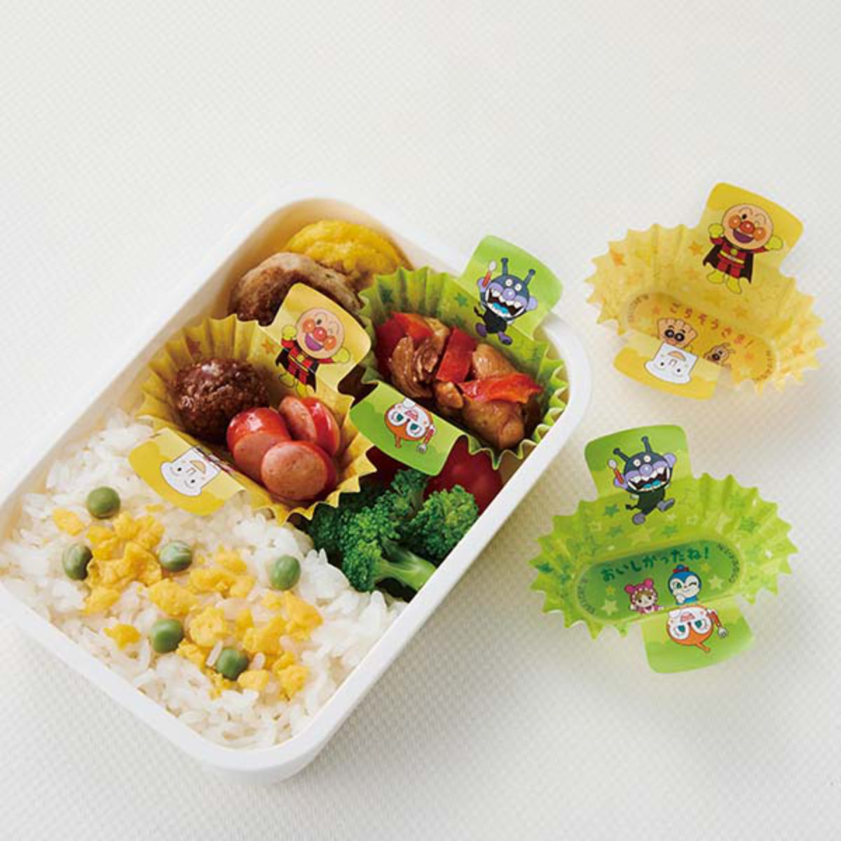 おかずの隙間からアンパンマンのキャラクター達が見えるおかずカップです。いつものお弁当が簡単に癒しのお弁当に変わります。2種類、それぞれ柄が異なるので、気分に合わせて使い分けできます。