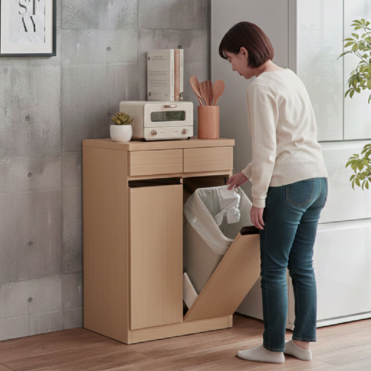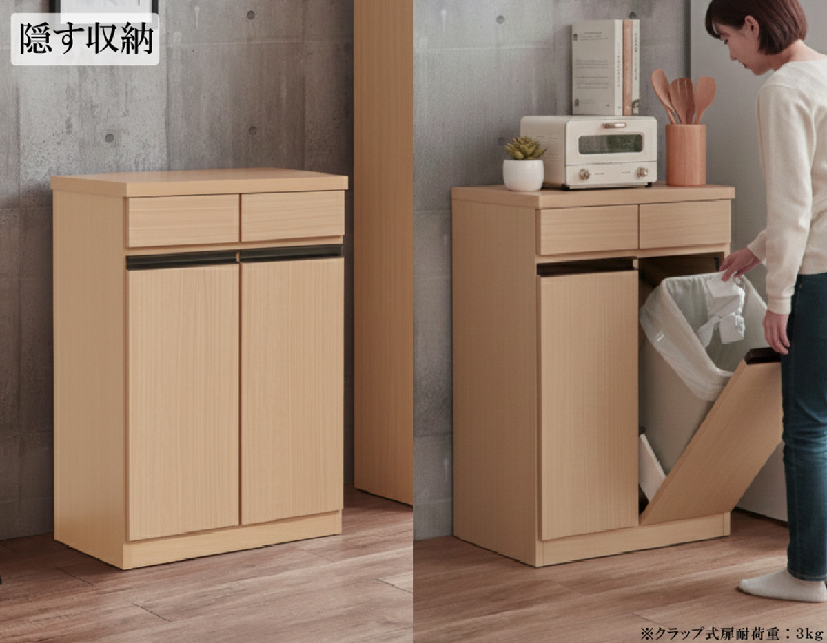 生活感が出やすいゴミ箱をすっきり隠して収納できる設計です。来客時でも見た目を損なわず、清潔感のあるキッチン空間を保てます。フラップ式で出し入れもしやすく、ゴミ捨てもしやすい設計です。