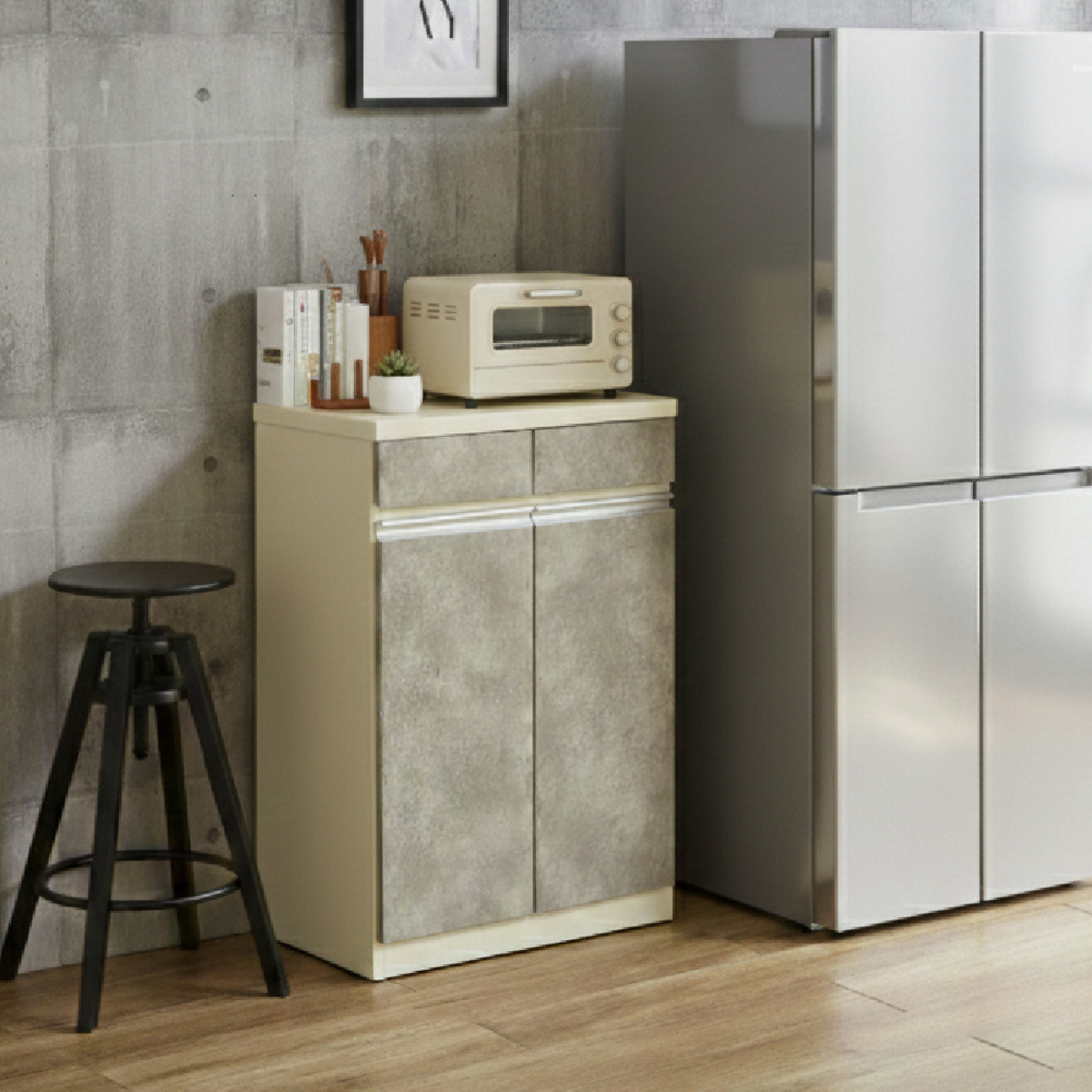 カトラリーやラップ、キッチンツールなどをすっきり収納できる引出し付きです。細かいアイテムも整理しやすく、必要なものをサッと取り出せるので作業効率もアップします。