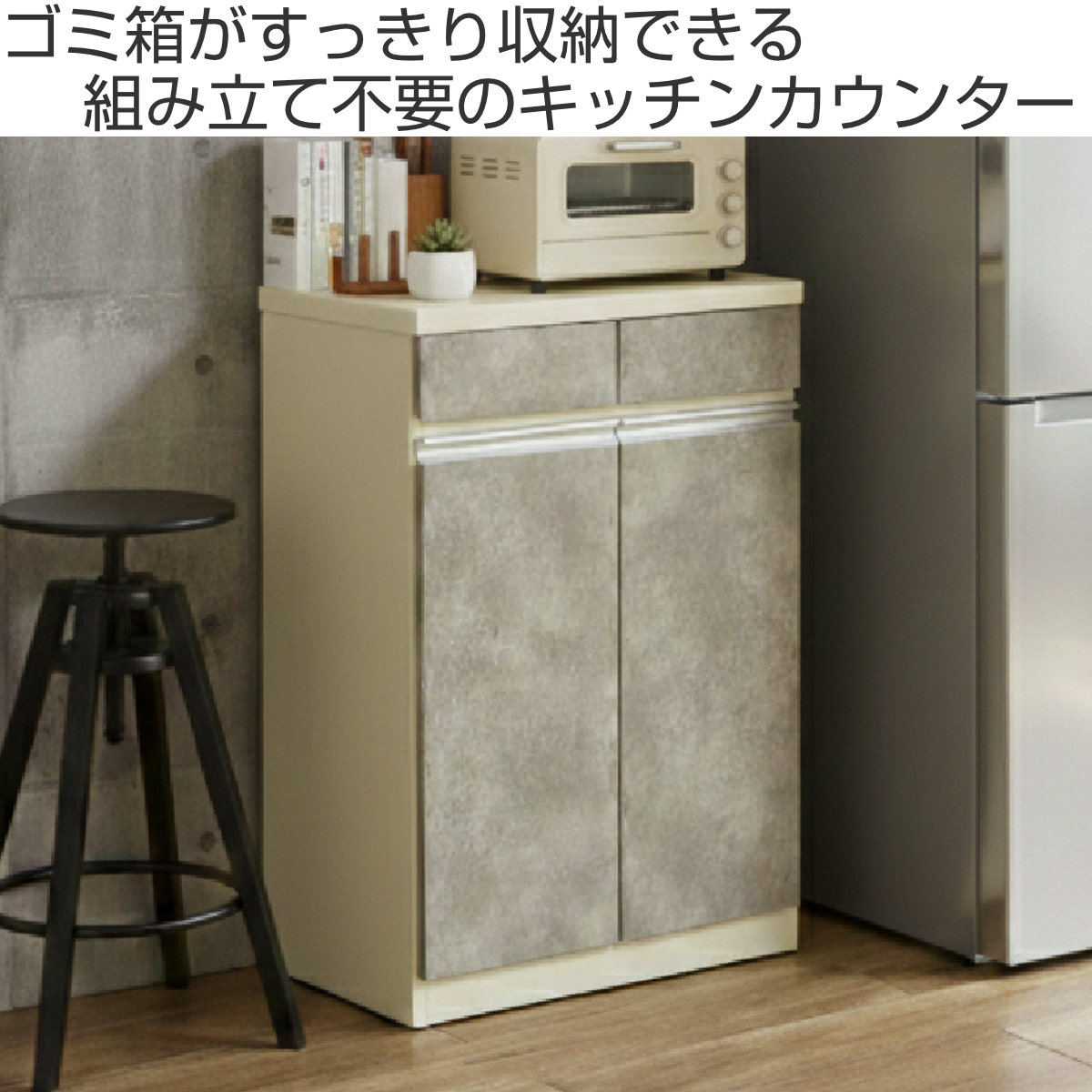 届いてすぐに使える完成品仕様のキッチンカウンターです。分別に便利なダストボックスが2個付属しており、ゴミ箱の置き場所に困らず、キッチンをすっきりと整えます。作業スペースと収納を一台で兼ね備えた、使い勝手の良いアイテムです。