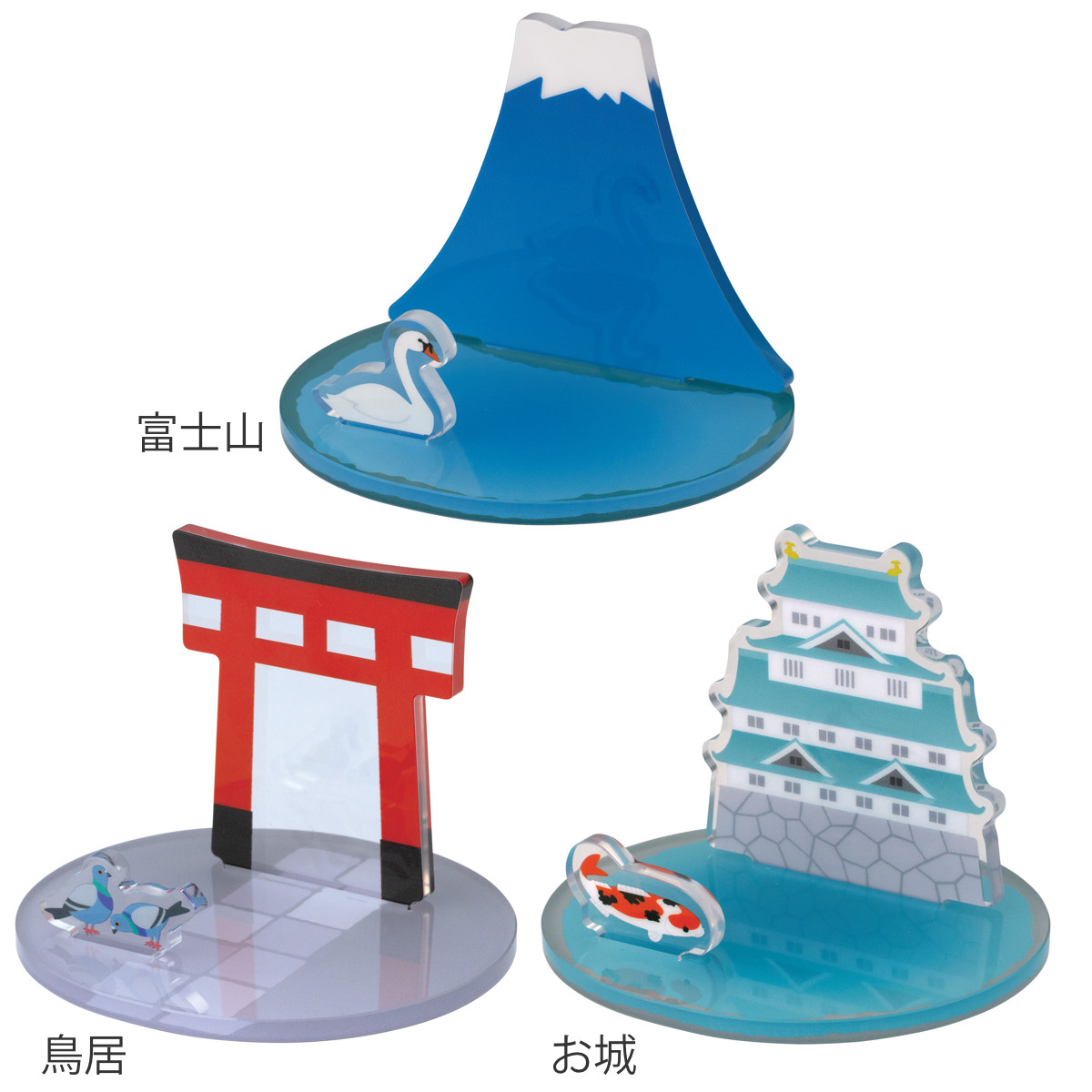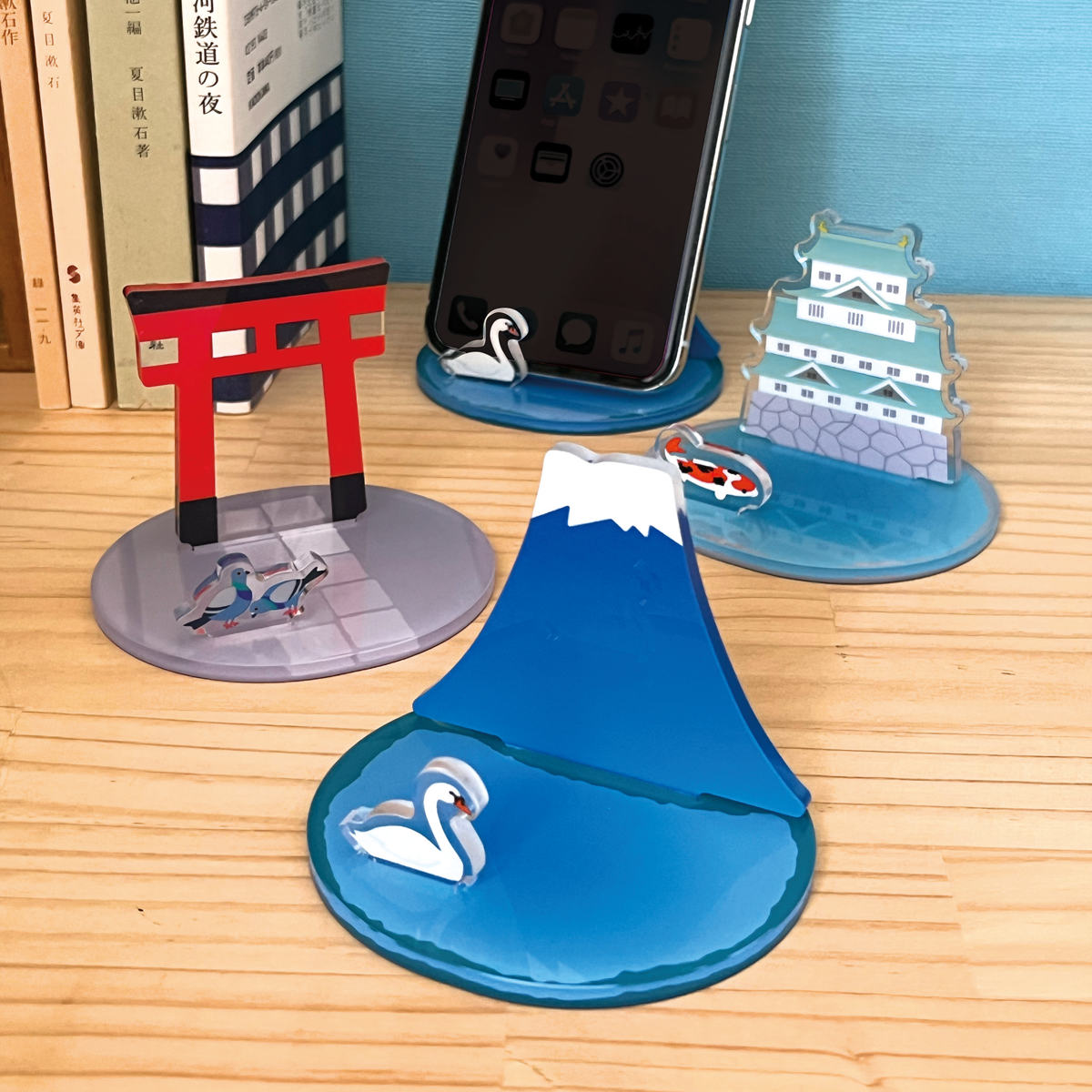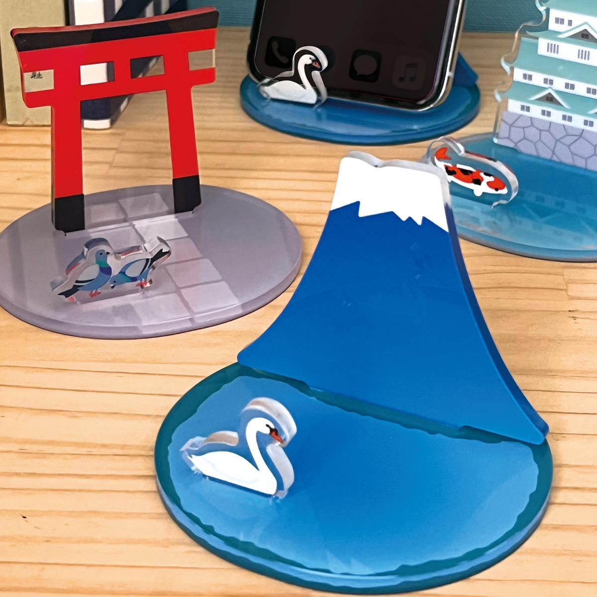 富士山や鳥居、お城など日本の風景をモチーフにしたアクリル製スマホスタンドです。透明感のあるデザインが美しく、デスクに和の雰囲気を添えます。実用性とインテリア性を兼ね備え、観光土産やギフトにもぴったりです。