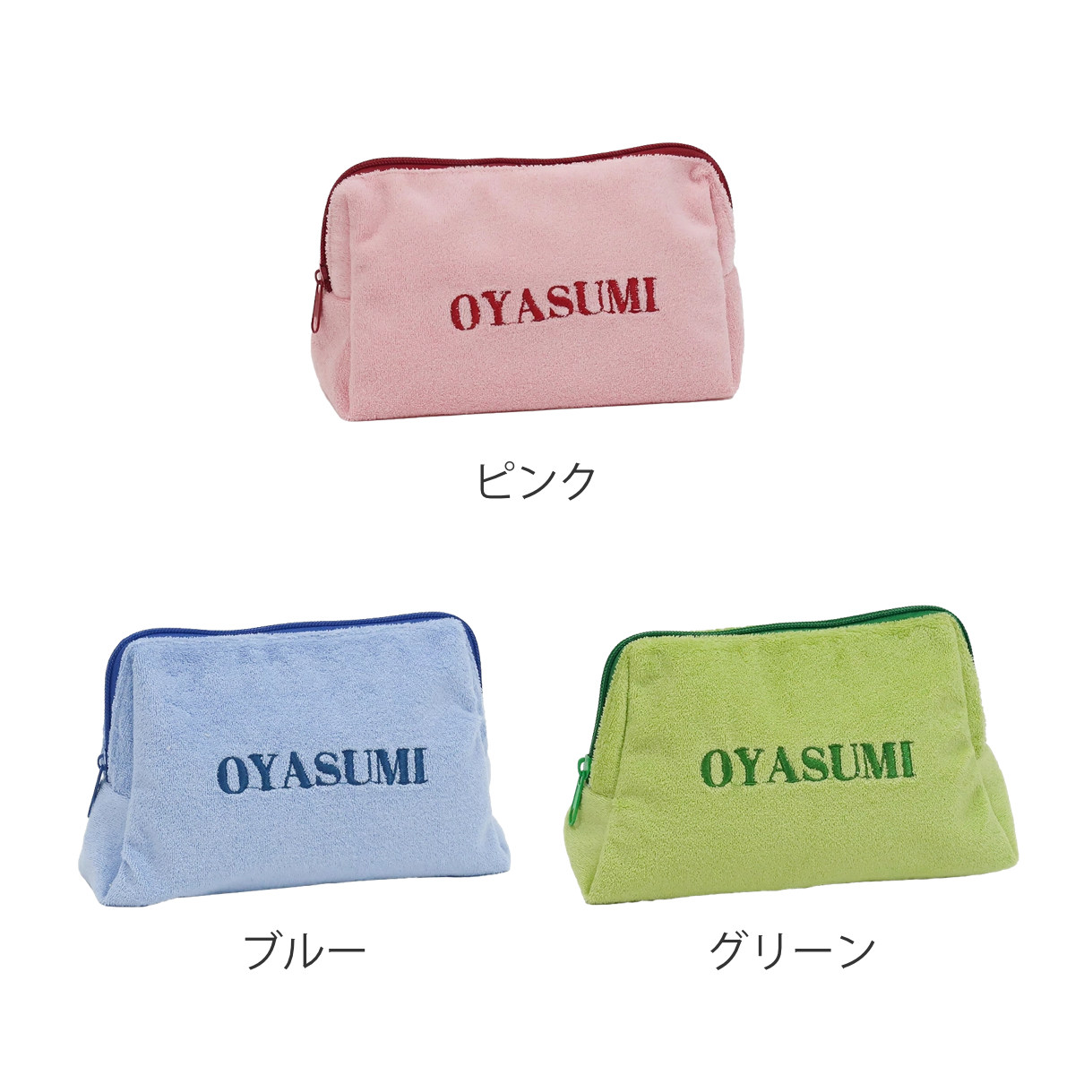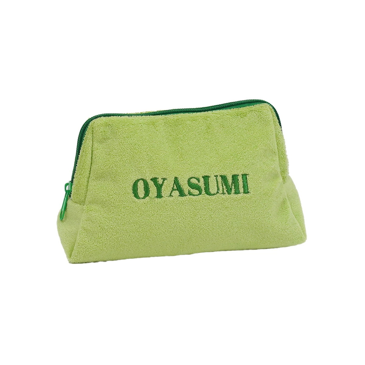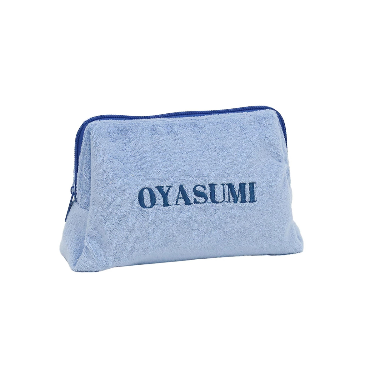 触り心地の良いパイル生地を使用した、大きめのポーチです。表面に刺繍された"OYASUMI"の文字が目を引く、シンプルながらも遊び心を感じるデザインです。