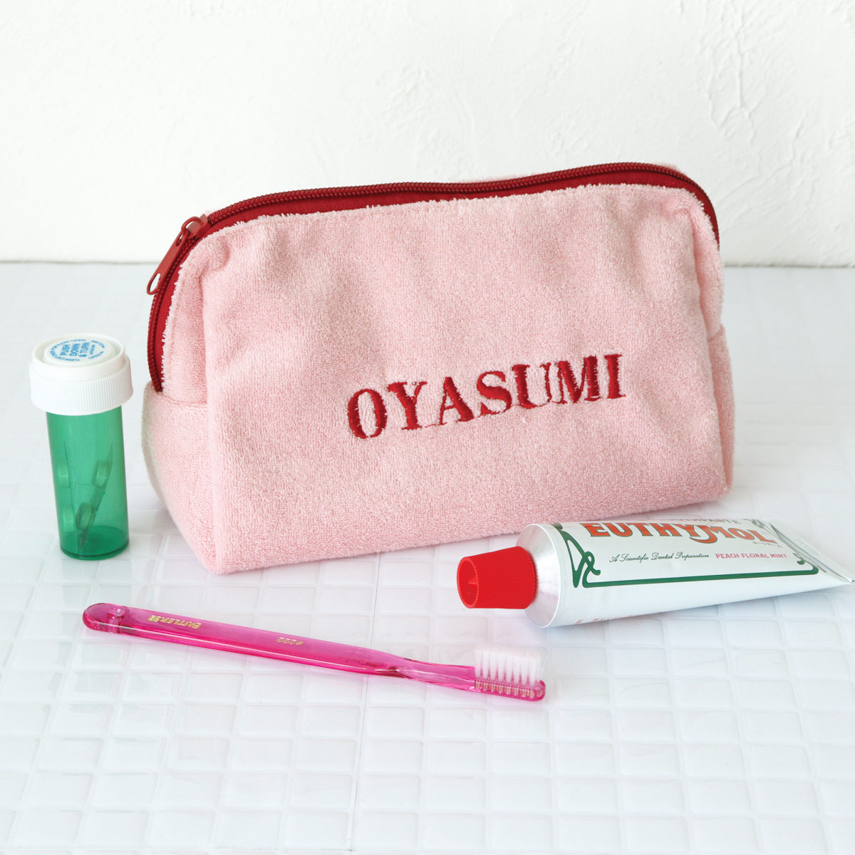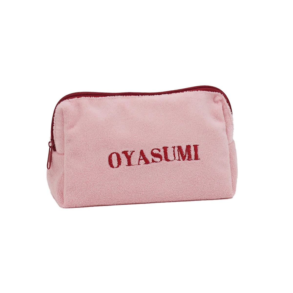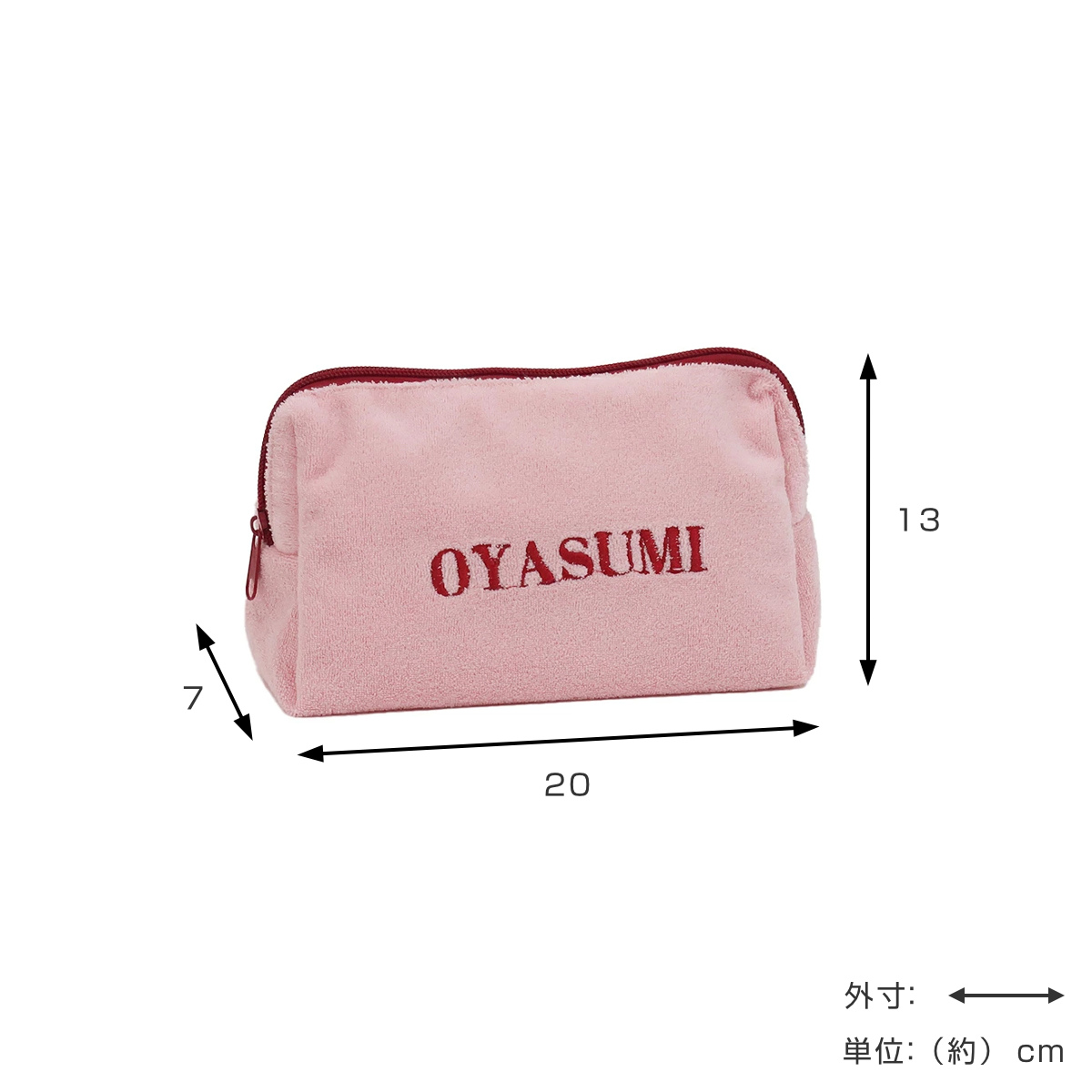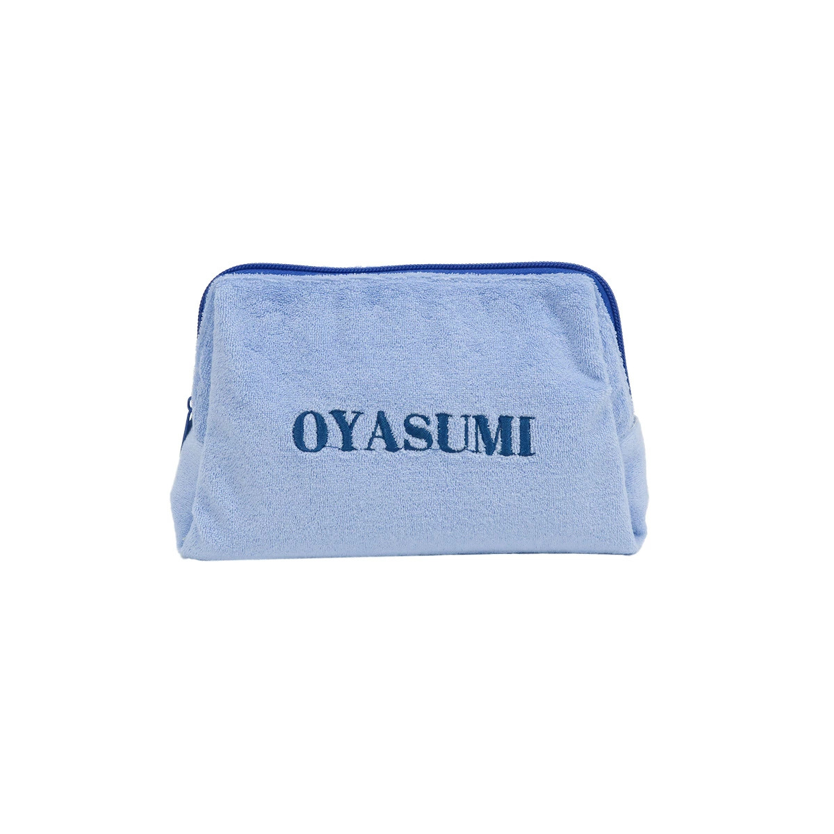 触り心地の良いパイル生地を使用した、大きめのポーチです。表面に刺繍された"OYASUMI"の文字が目を引く、シンプルながらも遊び心を感じるデザインです。