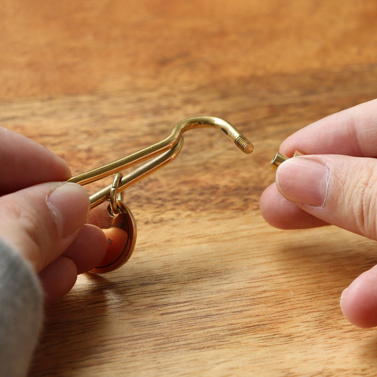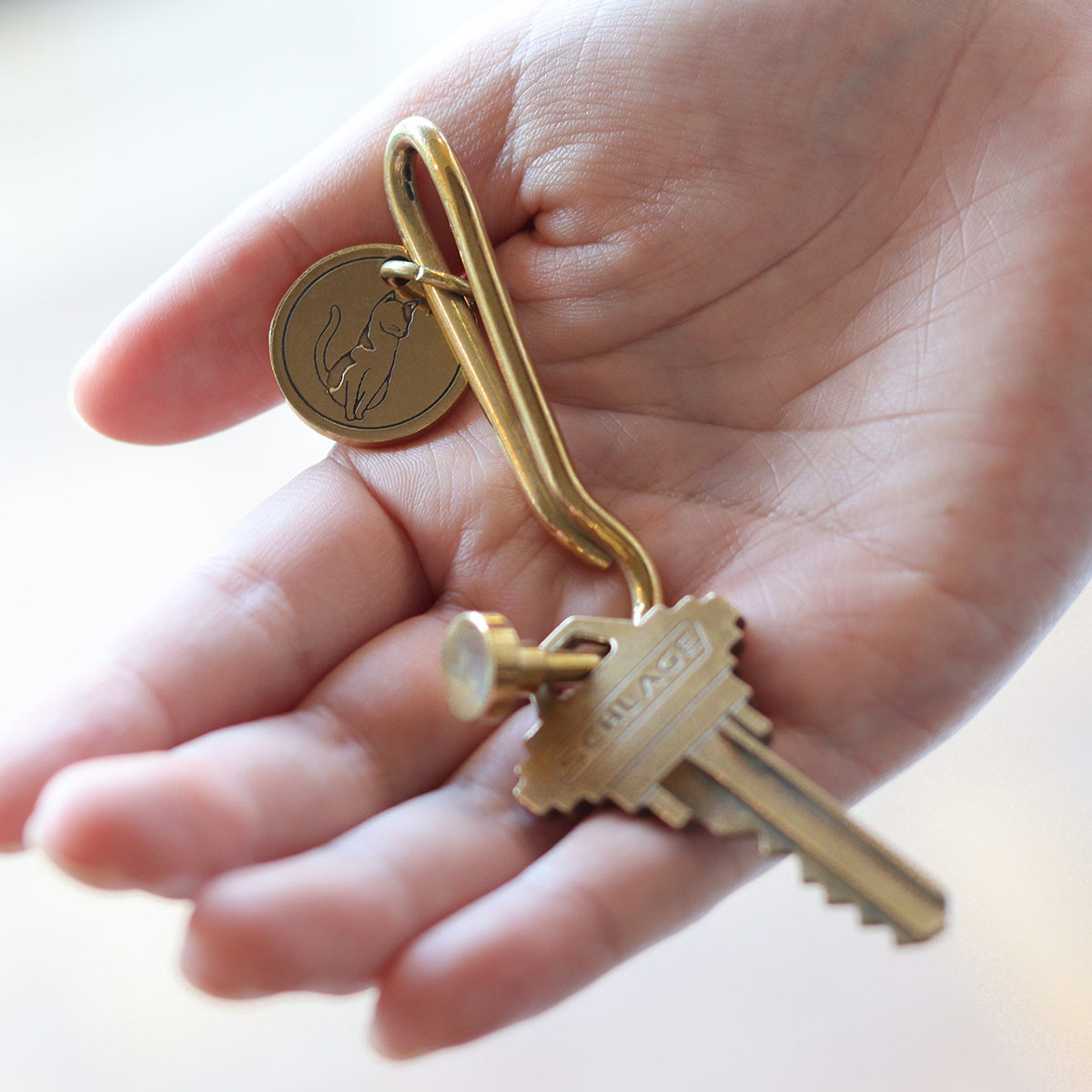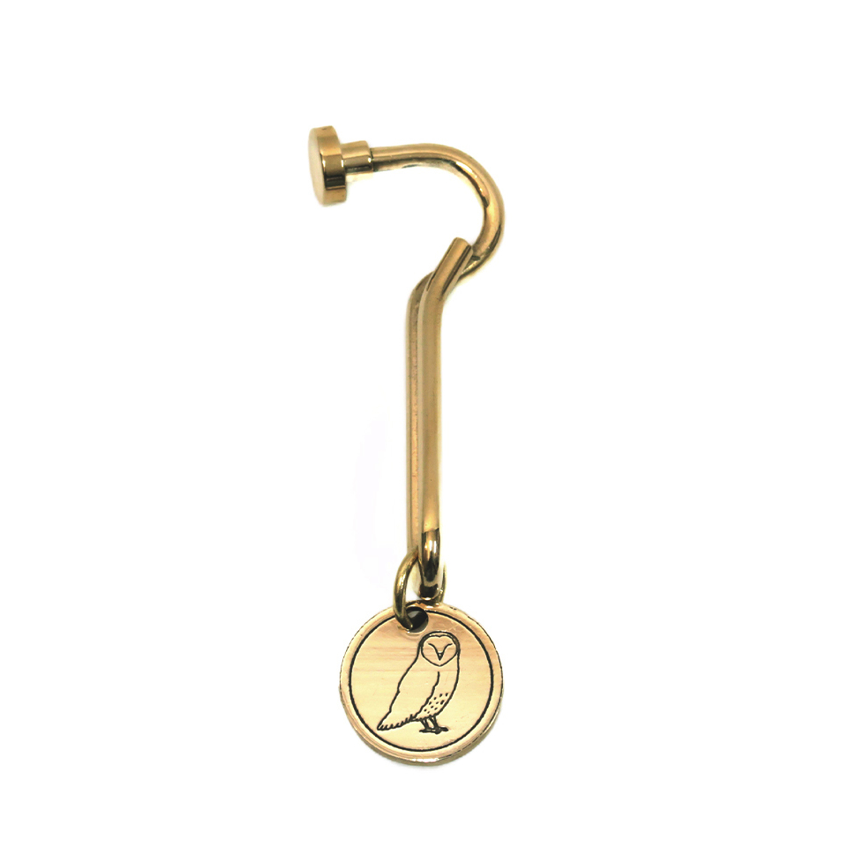 真鍮(ブラス)製のフックとオリジナルの刻印パーツを組み合わせたキーホルダーです。鍵に取り付けて使いやすく、日常使いにおすすめです。