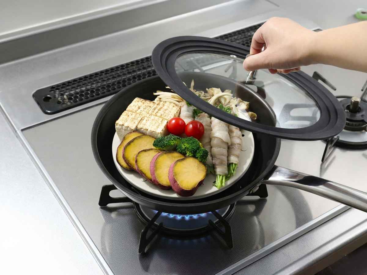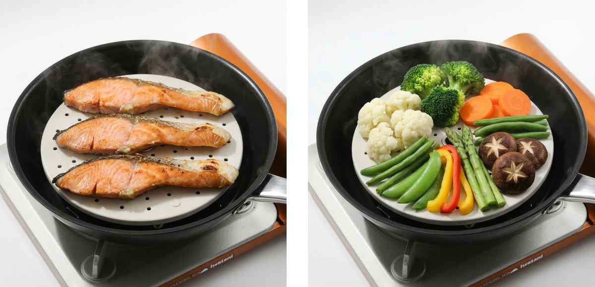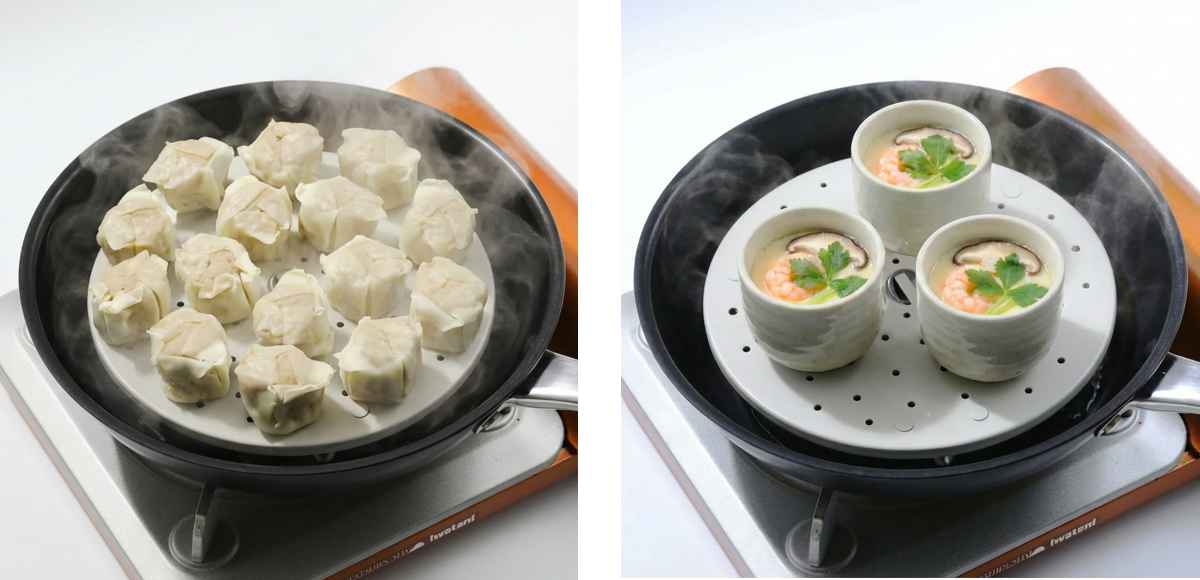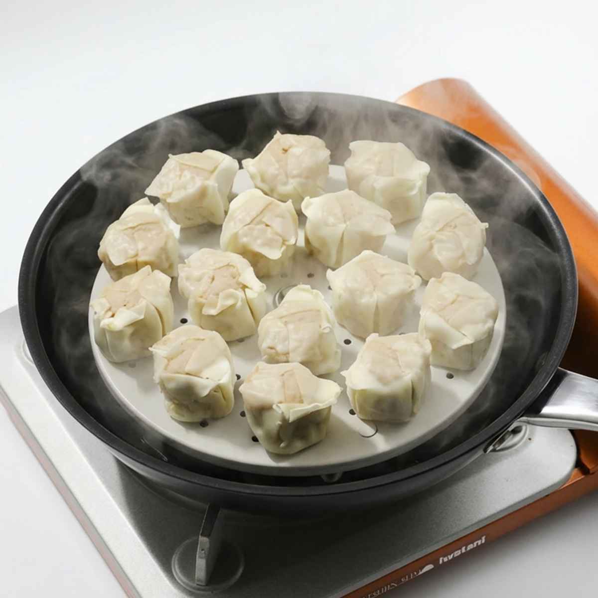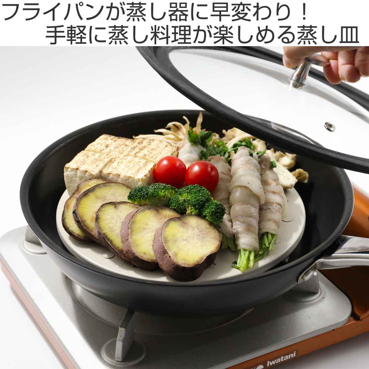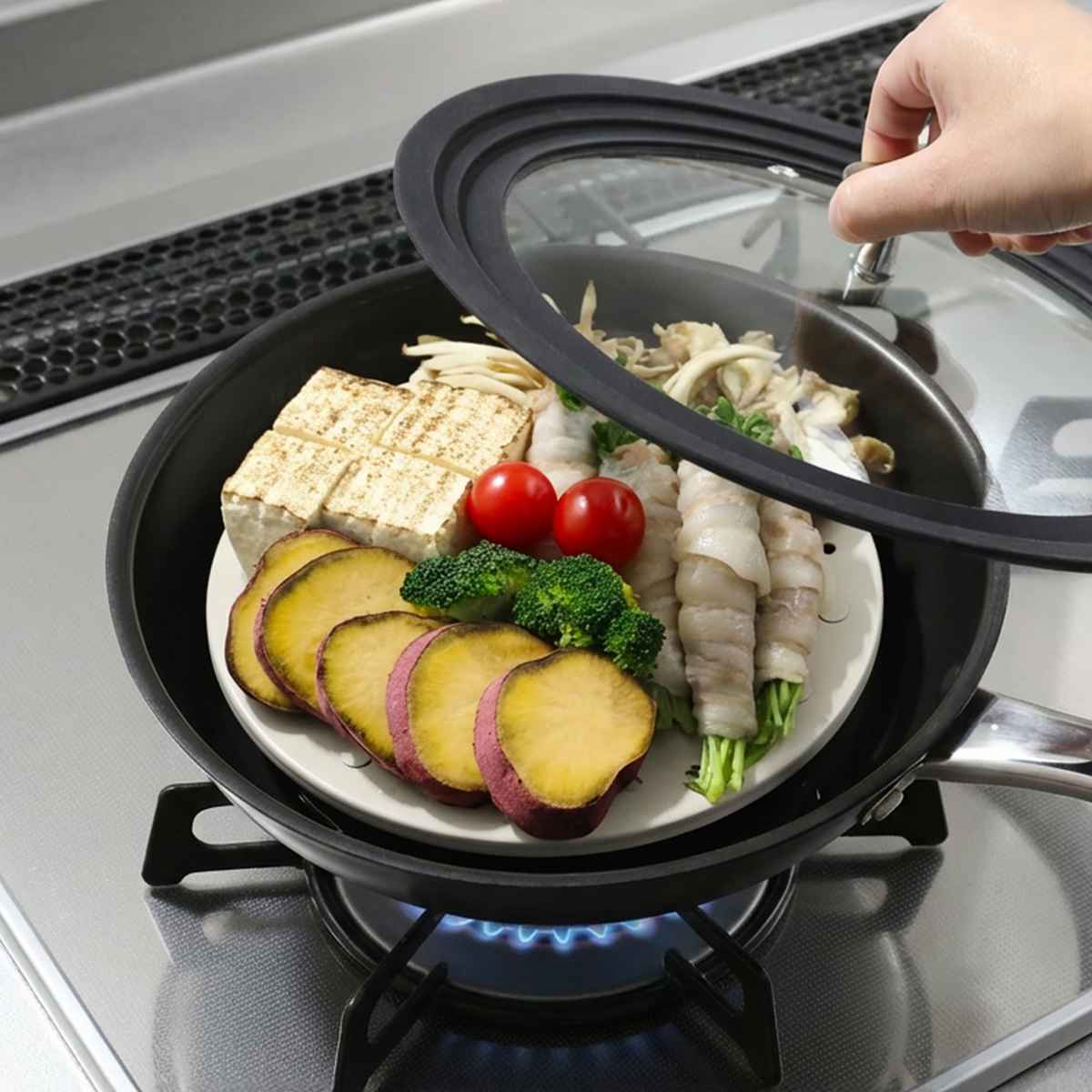 お手持ちのフライパンに乗せるだけで、手軽に蒸し料理を楽しめる蒸し皿です。あと一品欲しい時の副菜作りやお弁当のおかず作りにも活躍します。さっと簡単に洗うことができ、かさばらず収納できるのも嬉しいポイントです。