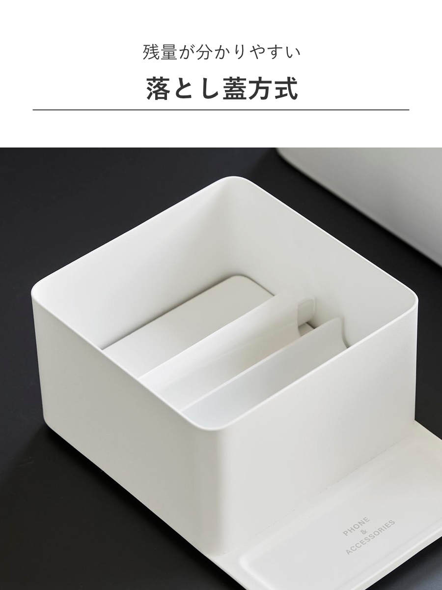 落とし蓋方式を採用しているため、ティッシュの残量がひと目で分かり、入れ替えや追加のタイミングも把握しやすくなっています。