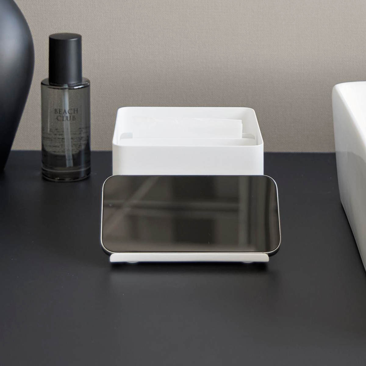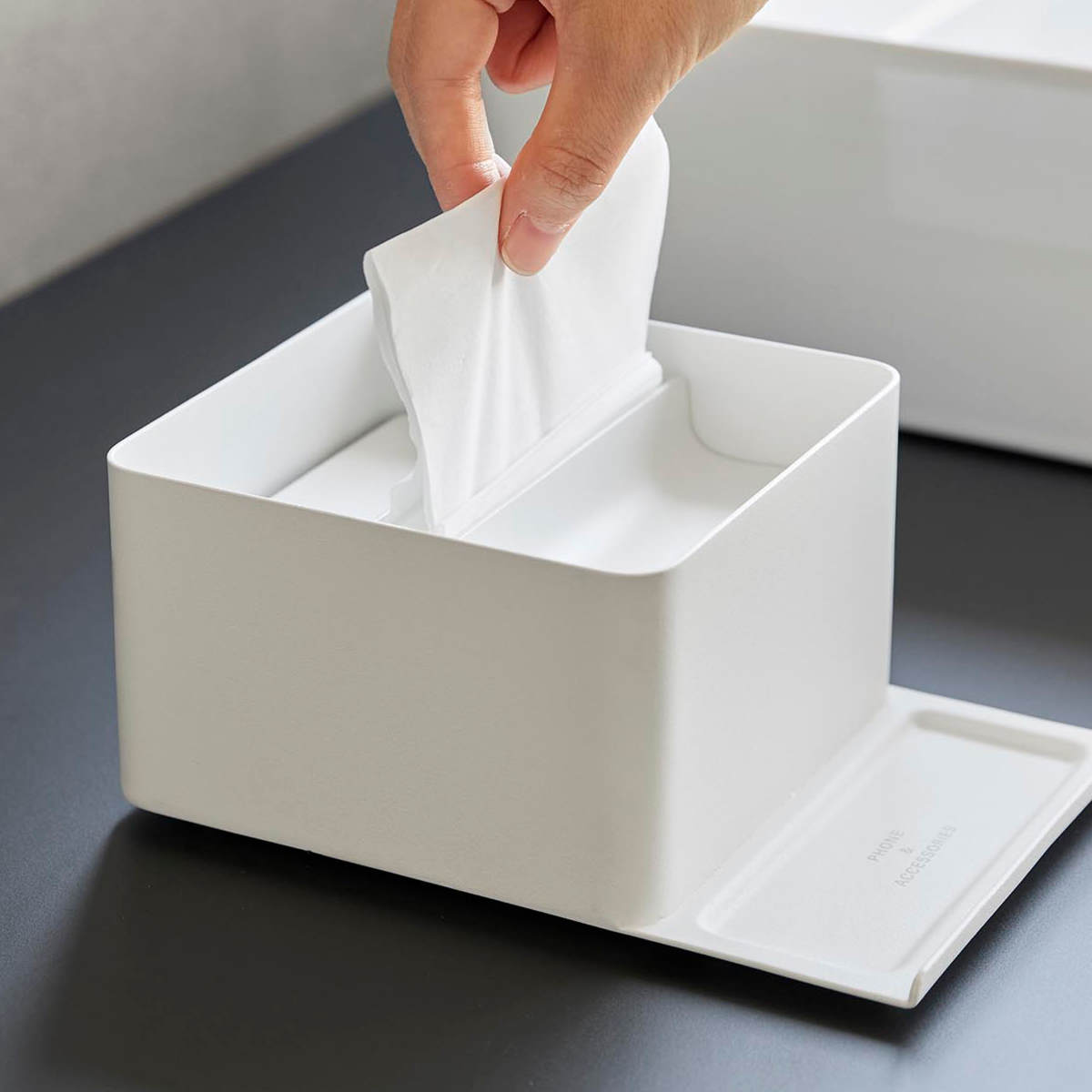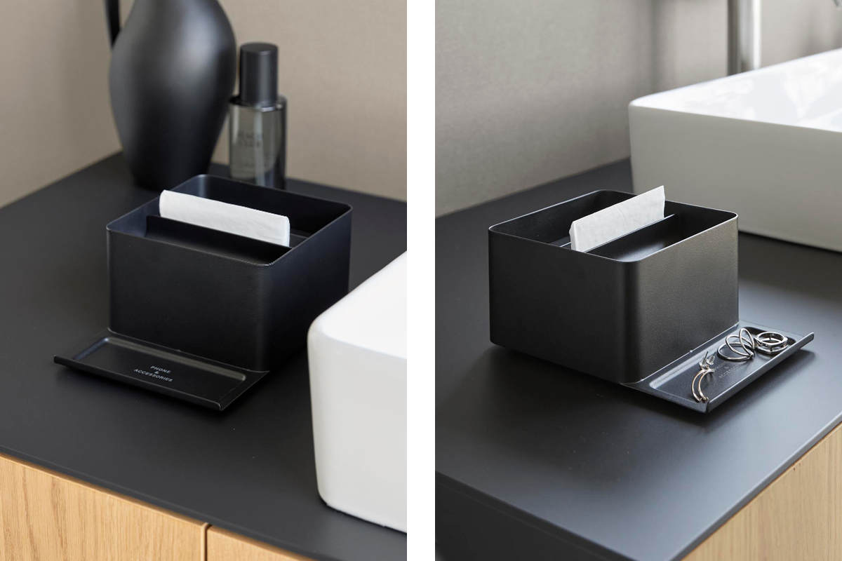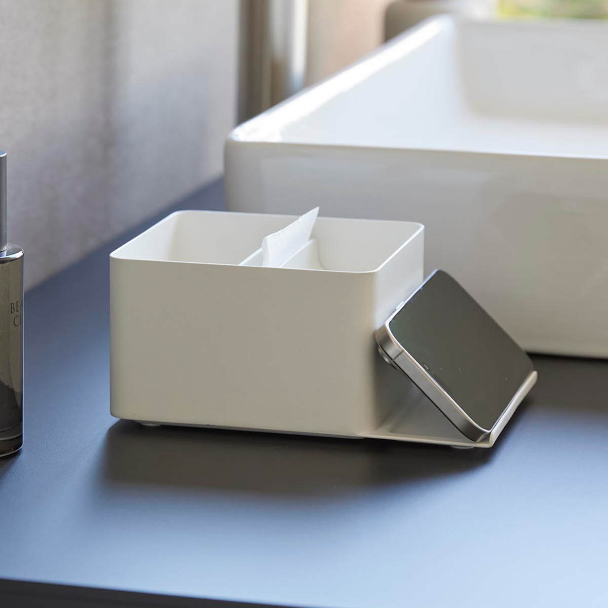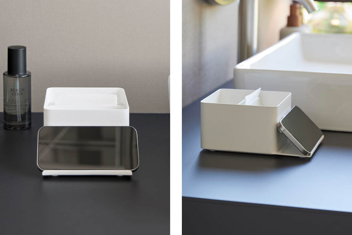 スマホスタンド付きで、動画や音楽を視聴しながら朝の支度ができるハーフティッシュケースです。コンパクトなサイズで限られたスペースの洗面台にもすっきり設置できます。