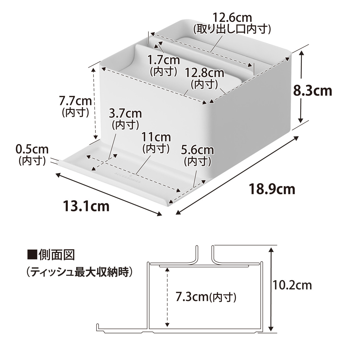 | サイズ | 約 幅13.1×奥行18.9×高さ8.3(cm) 最大収納時:約 高さ10.2(cm) 【内寸】 収納部:約 幅12.8×奥行12.8×高さ7.3(cm) ティッシュペーパー取り出し口:約 幅12.6×奥行1.7(cm) トレー部:約 幅11×奥行3.7(cm) |
