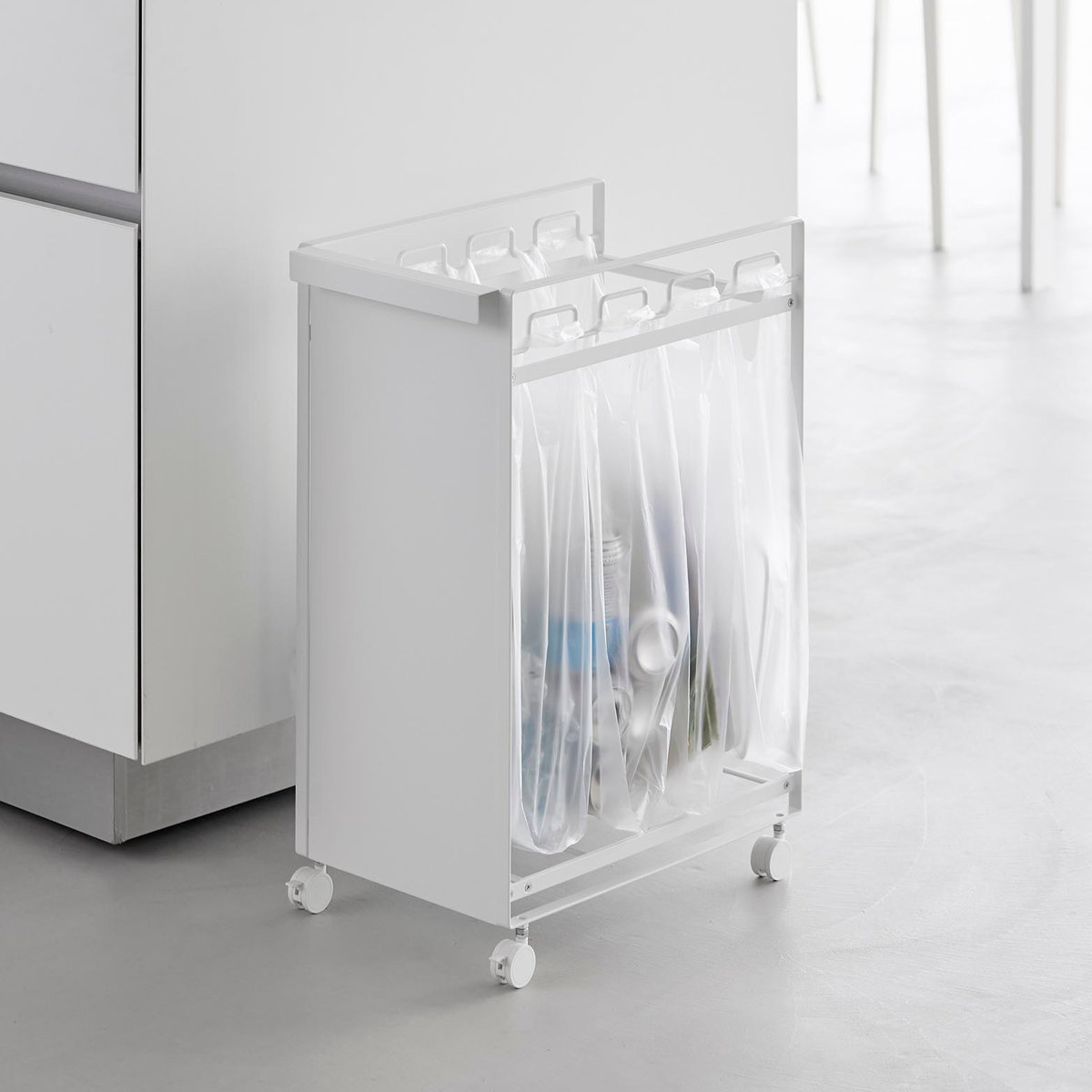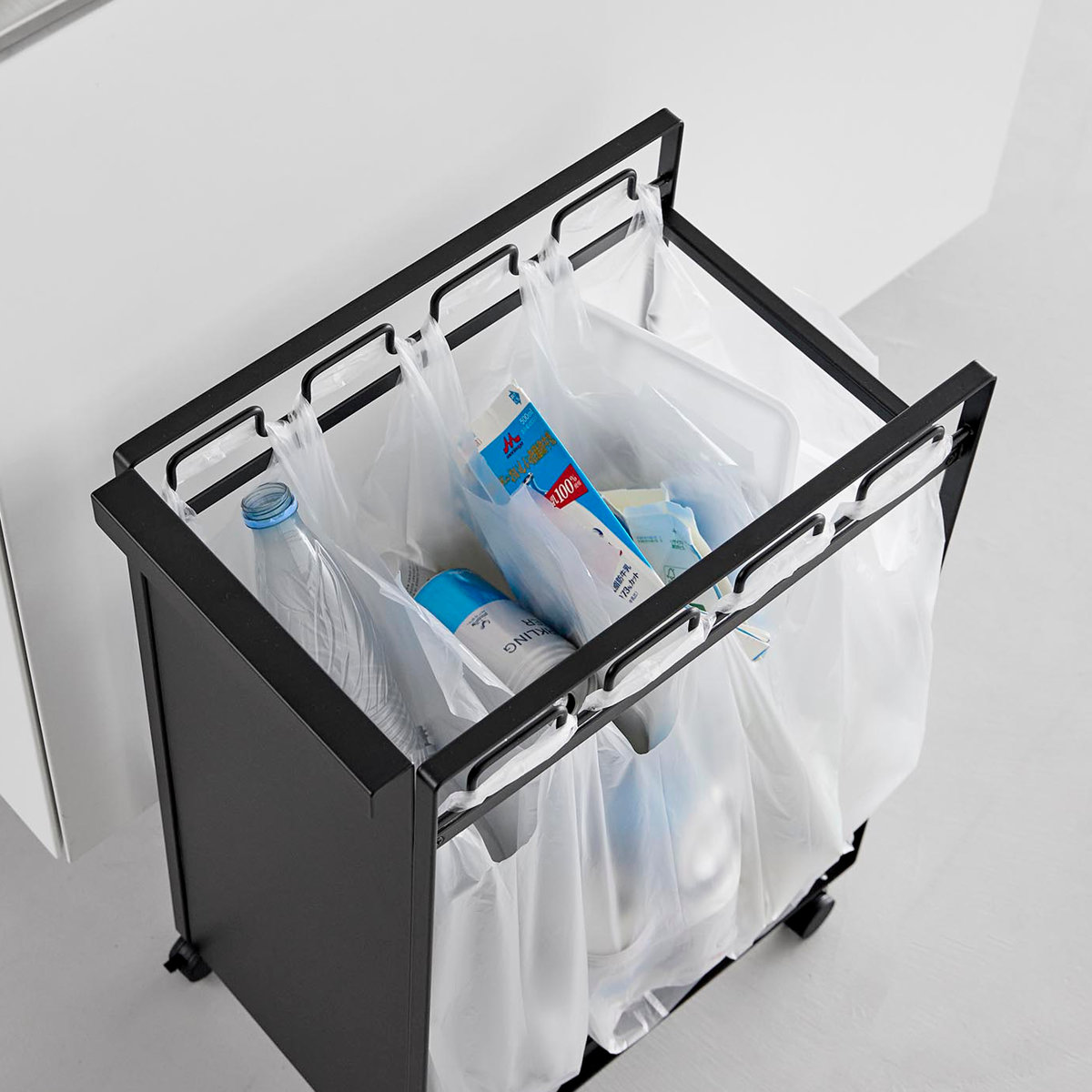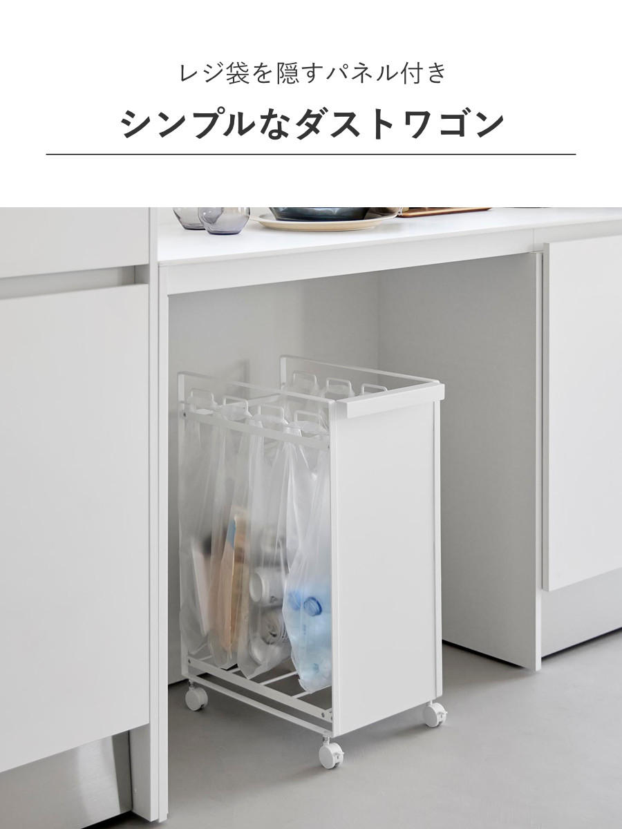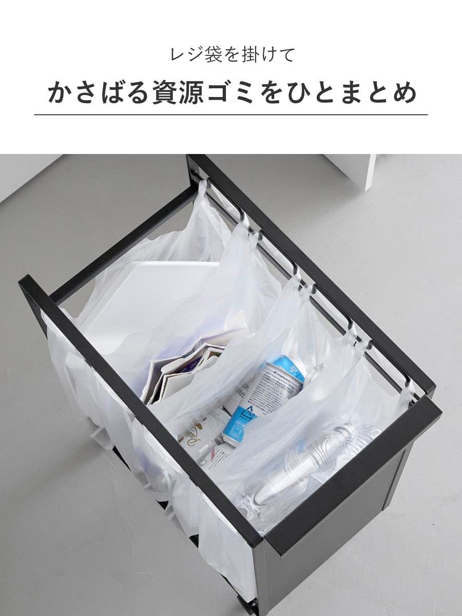 お手持ちのレジ袋や取っ手付きのゴミ袋をフレームに引っ掛けて使える分別ダストワゴンです。1台でビン・缶・ペットボトル・プラスチックなどを隠して分別できます。