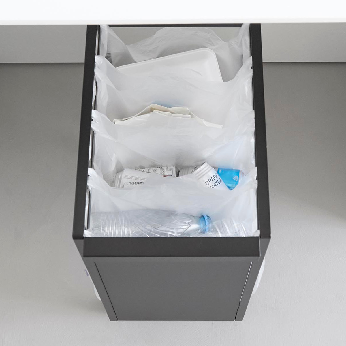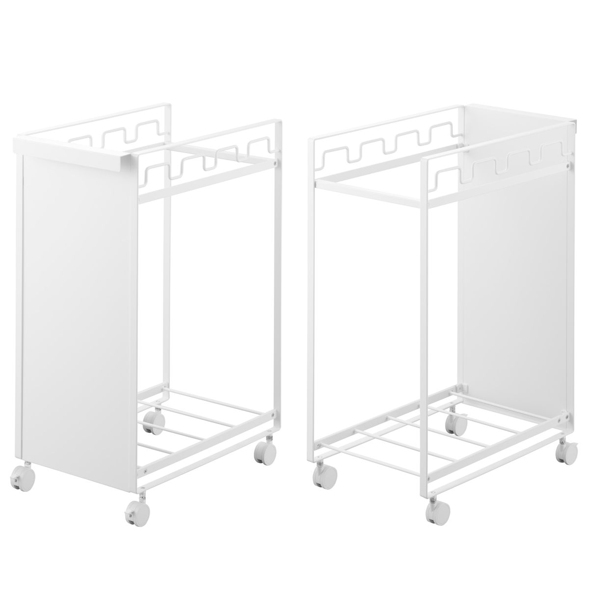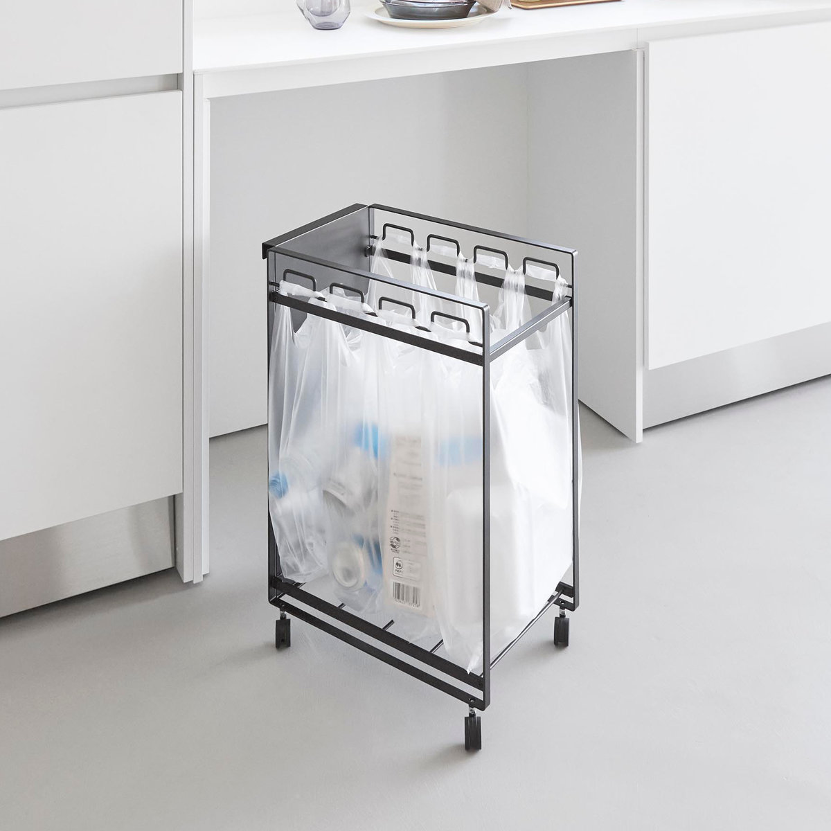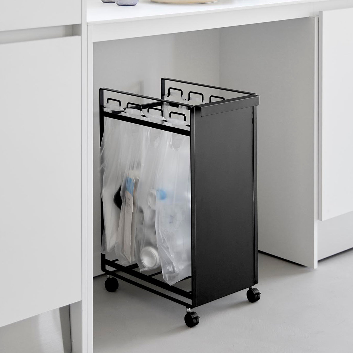 お手持ちのレジ袋や取っ手付きのゴミ袋をフレームに引っ掛けて使える分別ダストワゴンです。1台でビン・缶・ペットボトル・プラスチックなどを隠して分別できます。