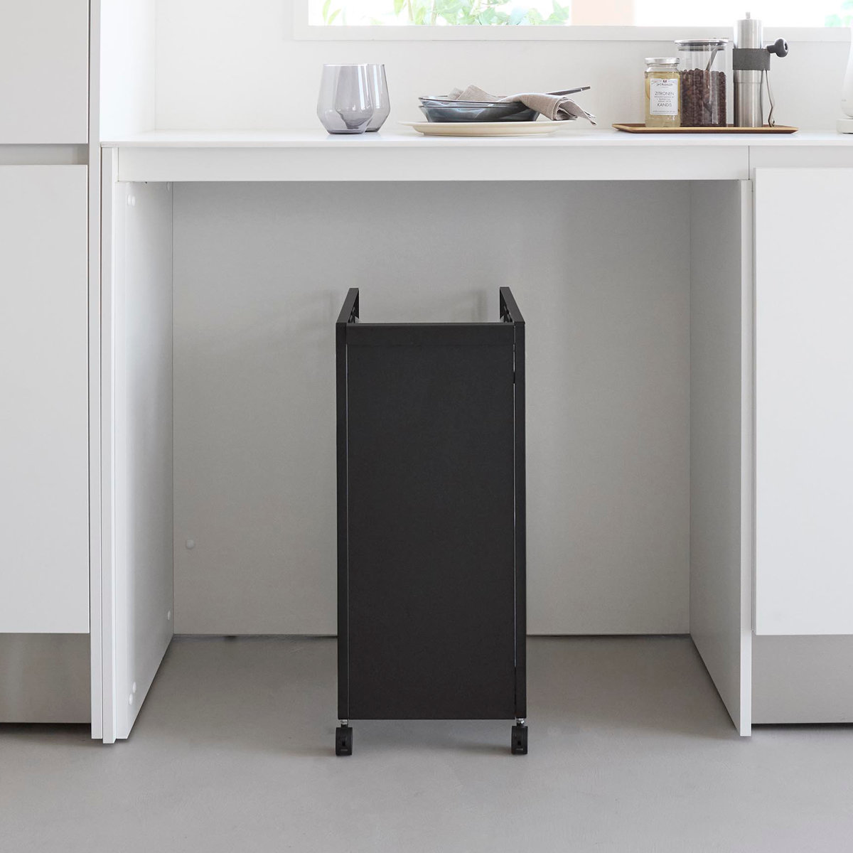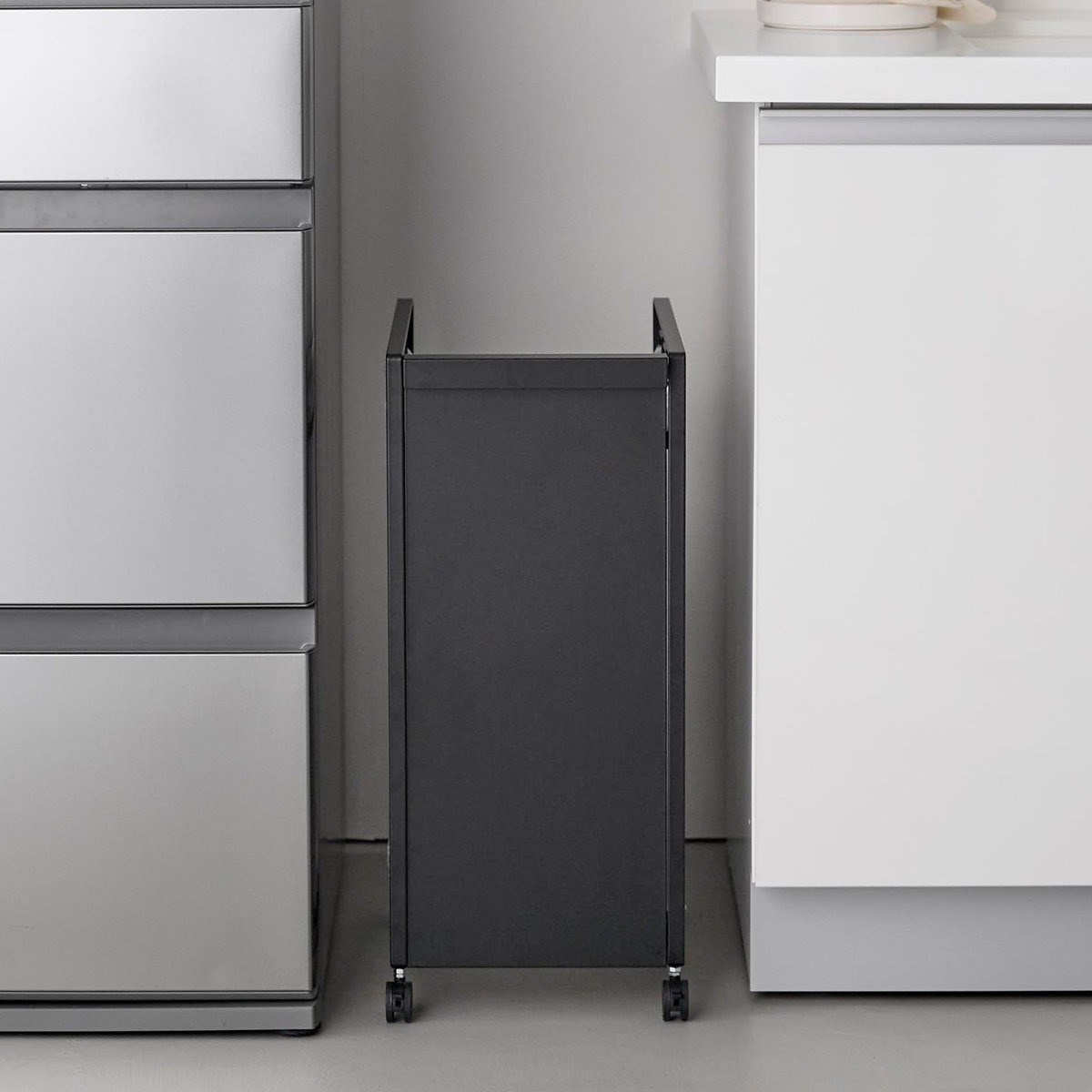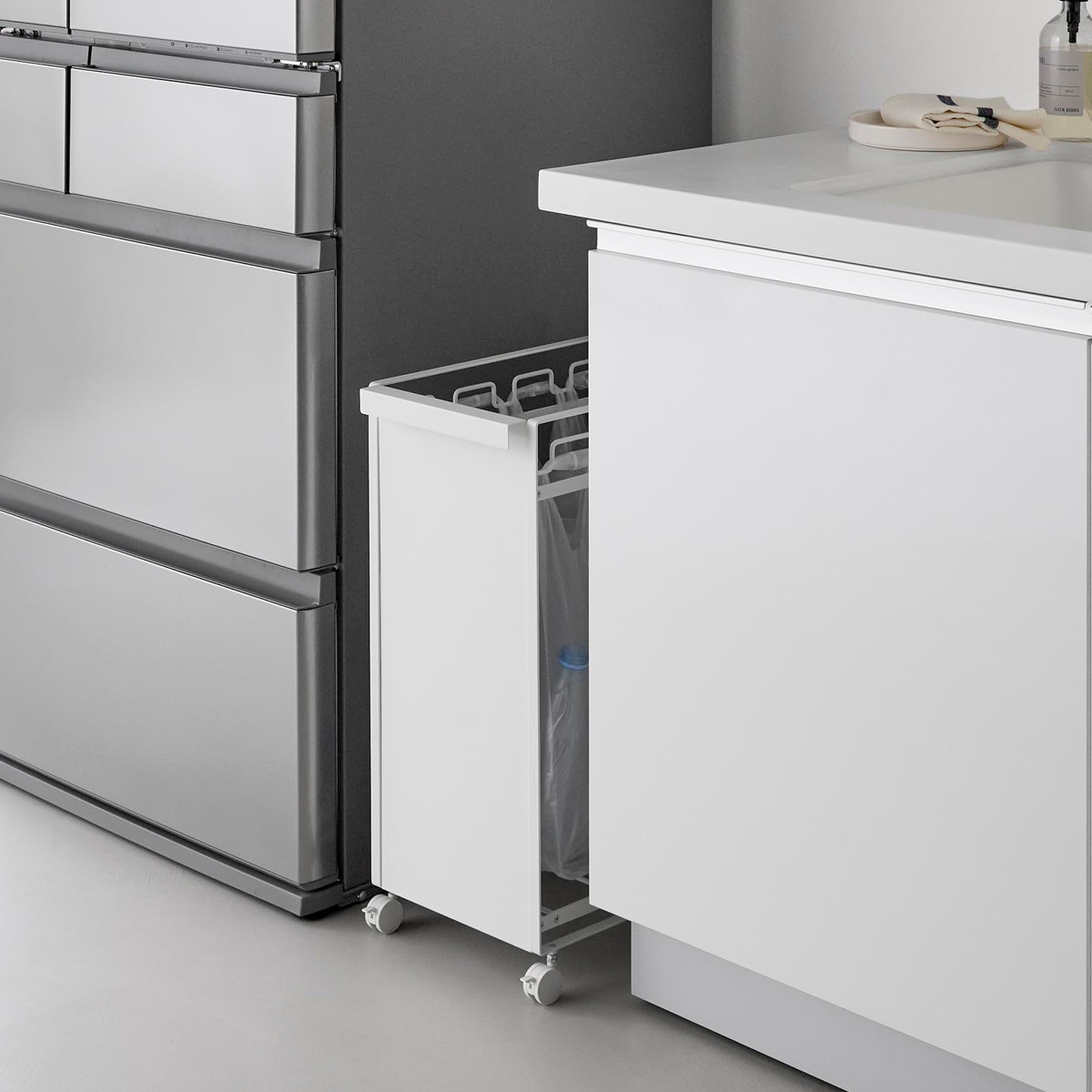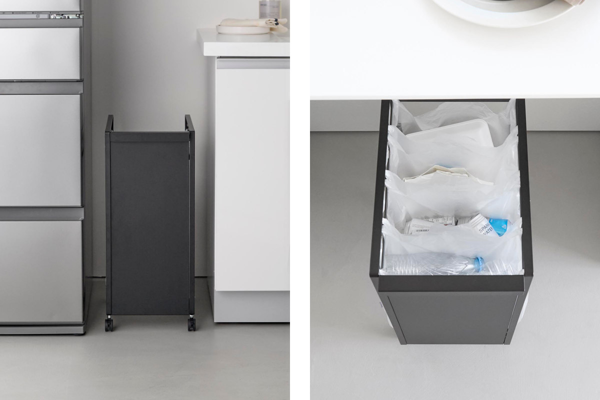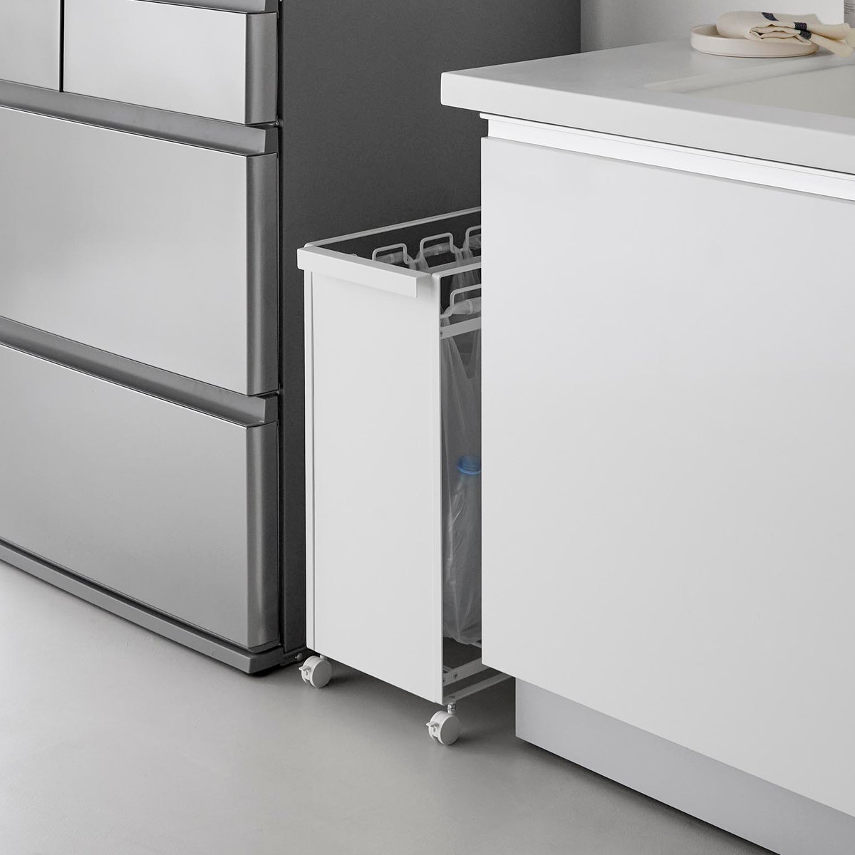 生活感の出てしまうゴミが正面から見えないようスチールパネルで隠せてキッチンがすっきり整います。置き場所に困りがちなダストワゴンを、冷蔵庫横のデッドスペースにも設置できます。