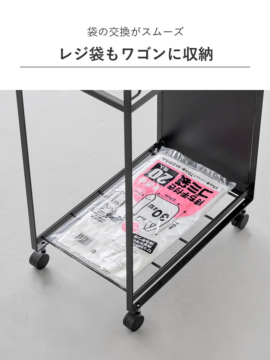 レジ袋のストックをワゴンの底面や置けるので、ストックの収納スペースにもなり、袋の取り換えがスムーズです。