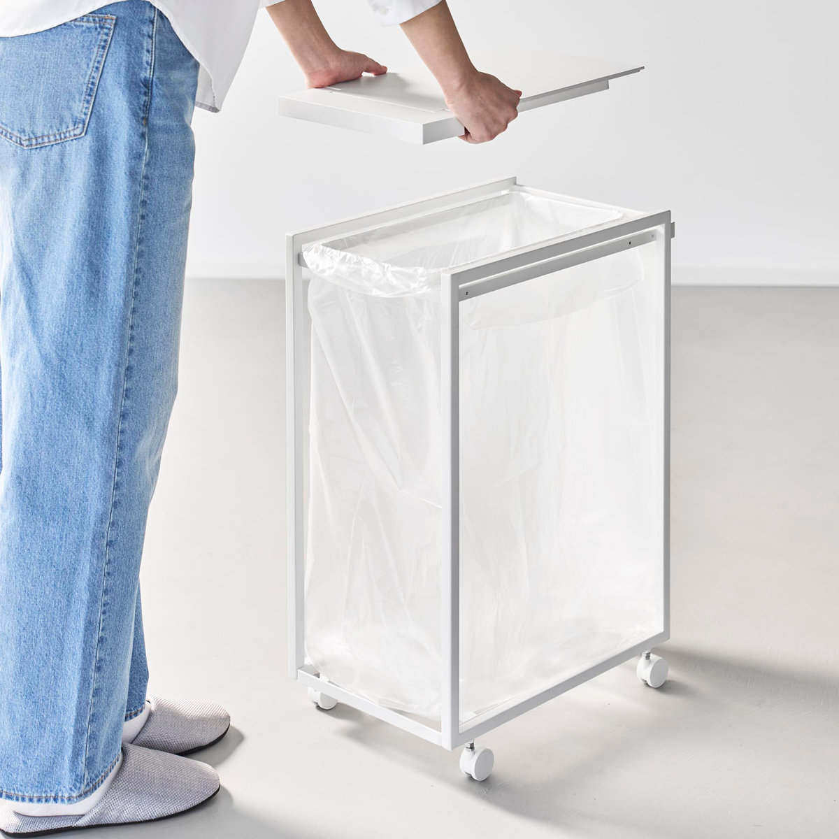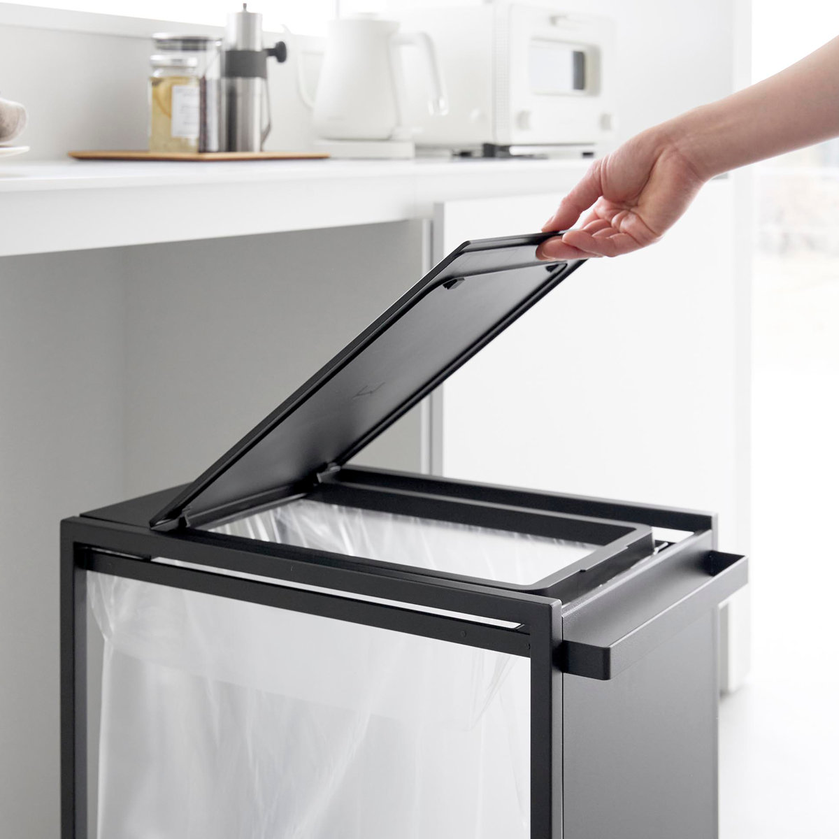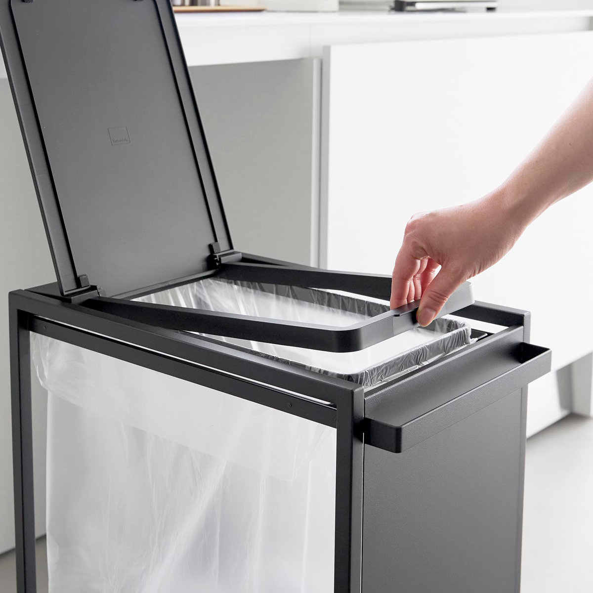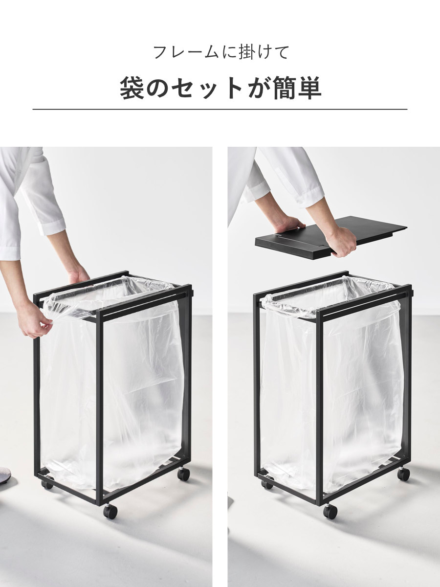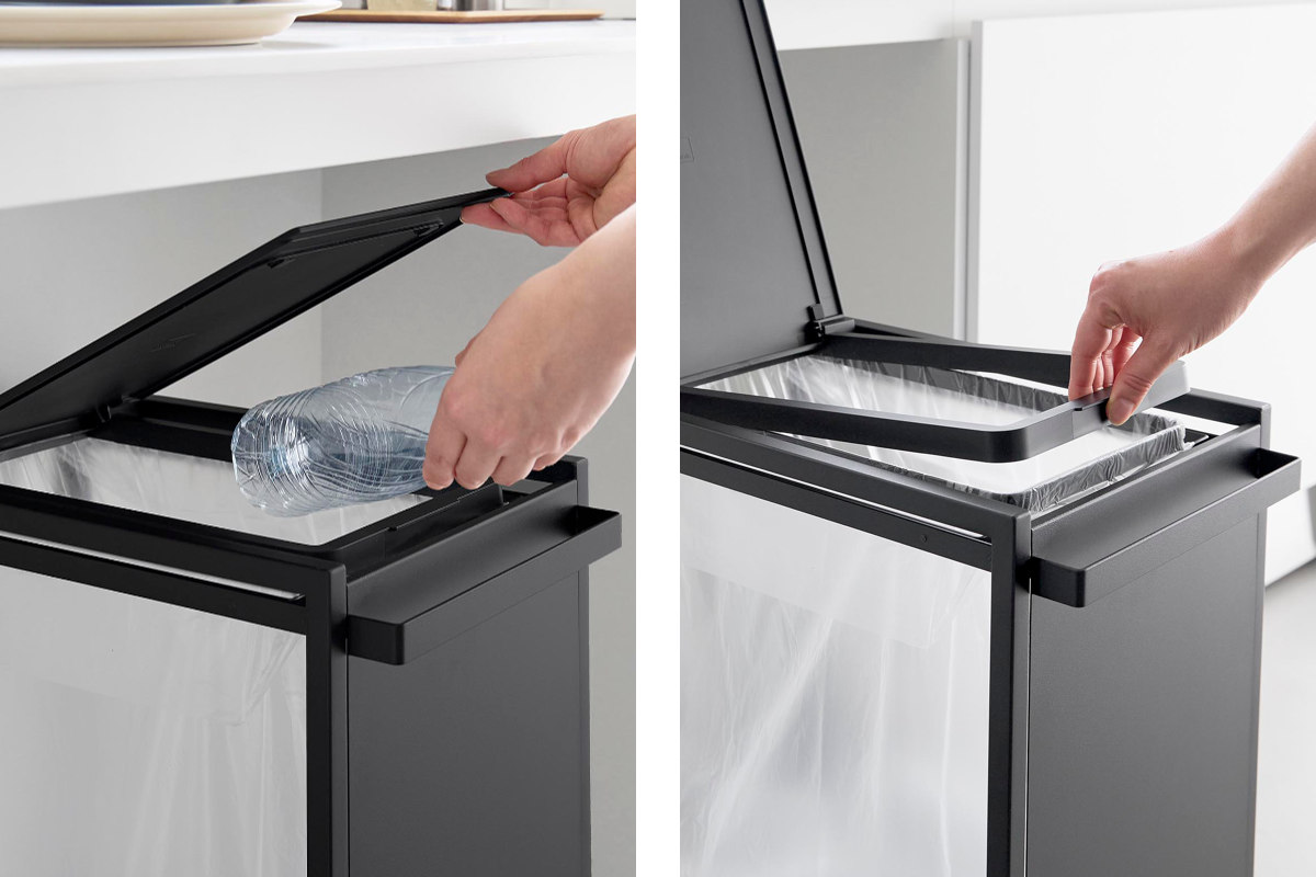 ゴミ袋をフレームに掛けて、上からフタでとめるだけのシンプルな構造です。手間なくセットでき、毎日の使いやすさにこだわりました。