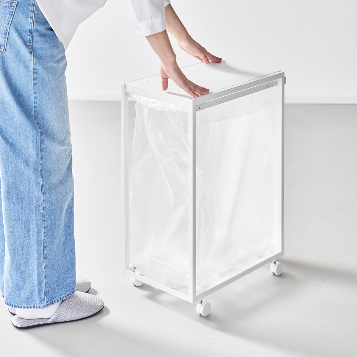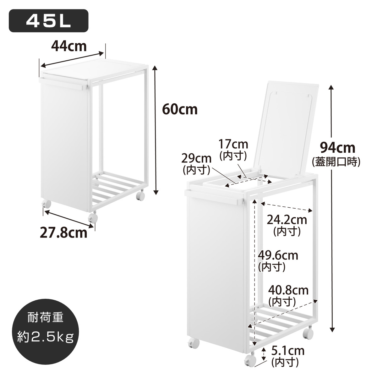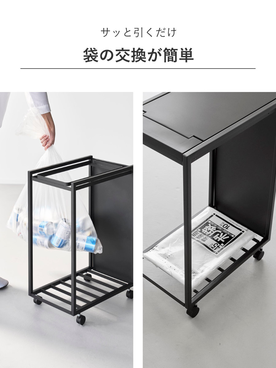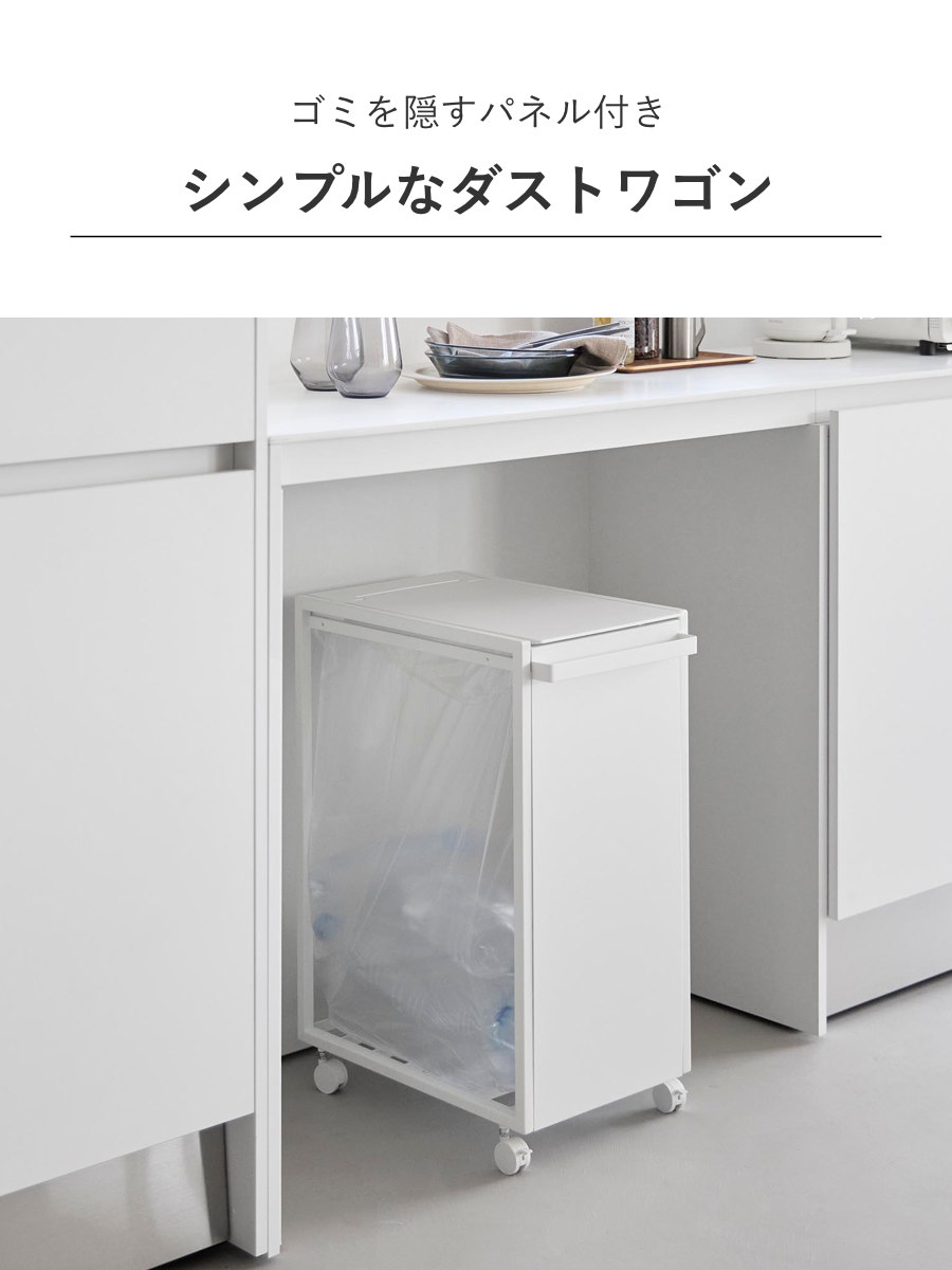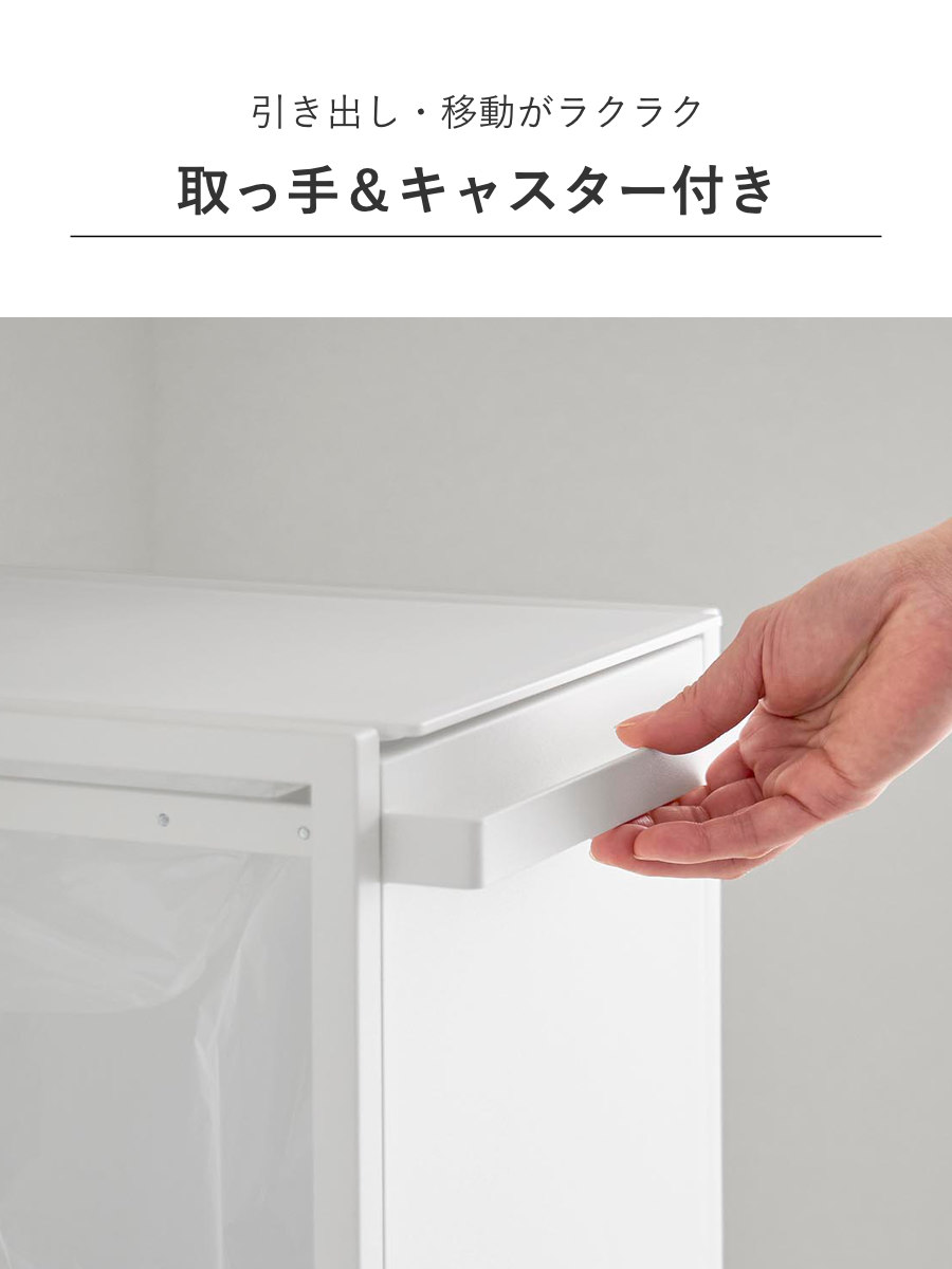 45Lのゴミ袋を目隠しできる、スタイリッシュな蓋付きダストワゴンです。カウンター下のスペースに収まる設計で、生活感を抑えながらすっきり収納でき、インテリアにも自然に馴染みます。