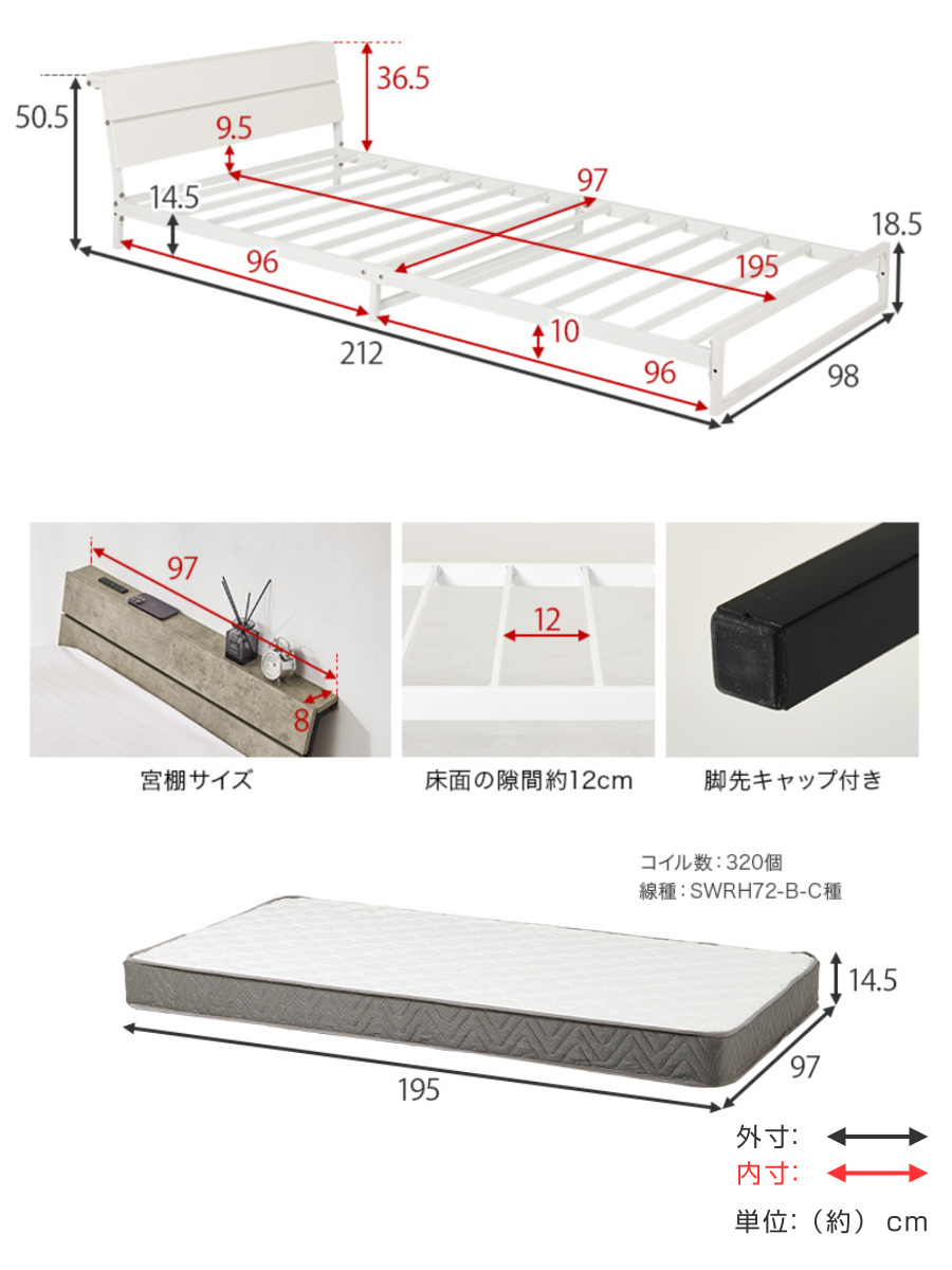 | サイズ | 【ベッド】 約 幅98×奥行212×高さ50.5×床面高14.5(cm) 【マットレス】 約 幅97×奥行195×高さ14.5(cm) |