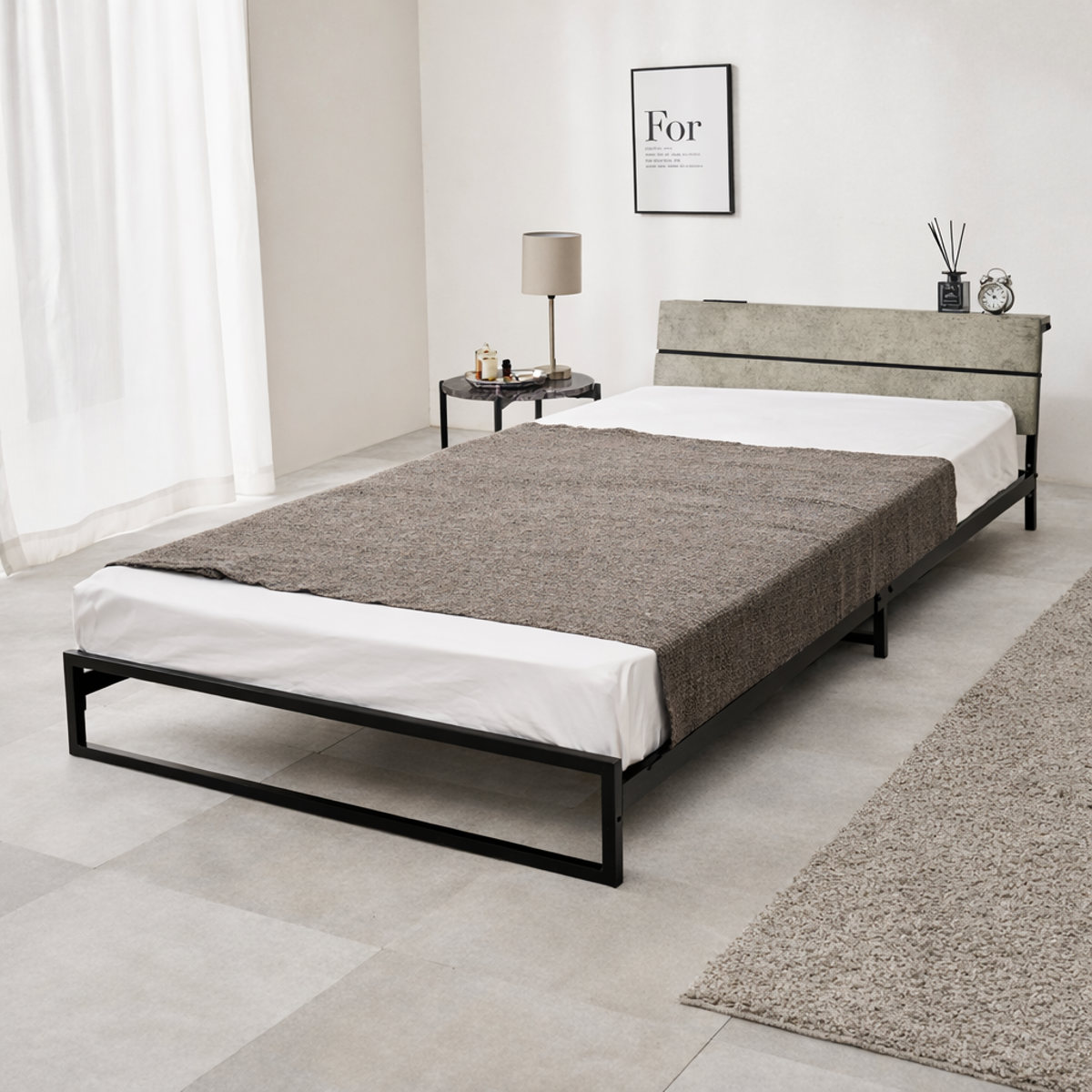 無骨で美しいスチールフレームのロータイプベッドのボンネルコイルマットレス付きです。見た目もすっきり、無駄のない洗練されたデザインがお部屋を広く見せ、インテリアに自然に馴染みます。