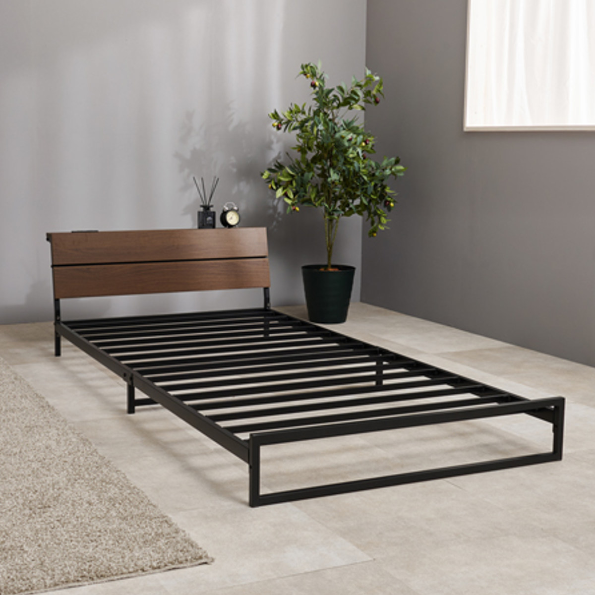 スマホや時計、小物をまとめて置ける便利な宮棚付きです。コンセントはお部屋のレイアウトに合わせて左右どちらにも付け替え可能です。