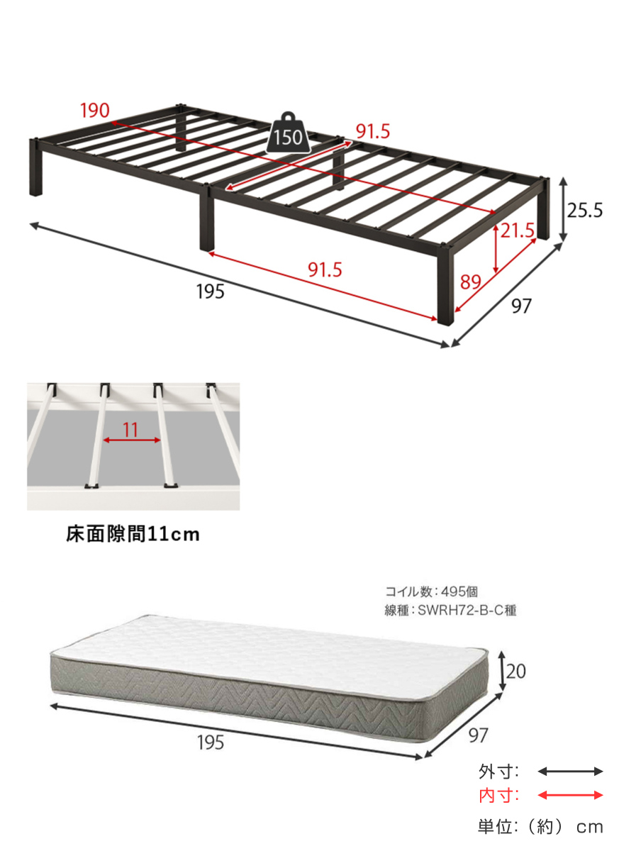 | サイズ | ベッド:約 幅97×奥行195×高さ25.5(cm) マットレス:約 幅97×奥行195×高さ20(cm) |