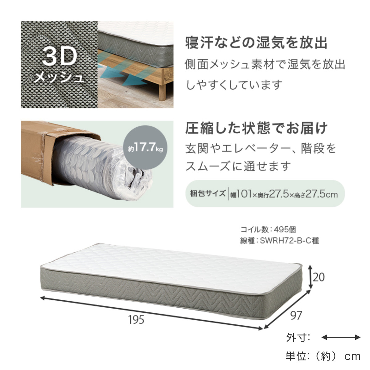 | 材質 | ベッド:スチール マットレス:〈主材〉ポケットコイル(コイル数:495個)、〈張地〉ポリエステル |
