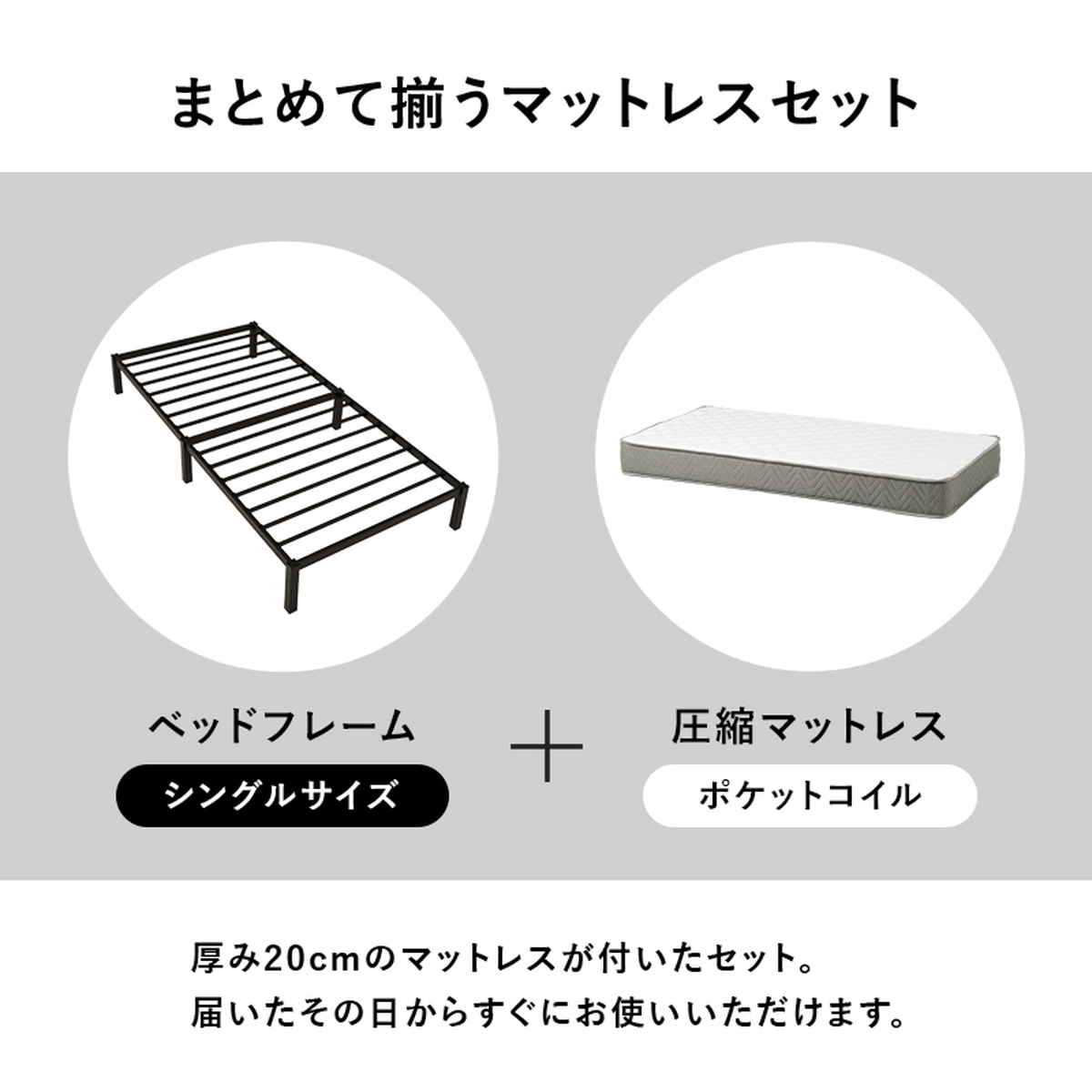 厚み20cmのマットレスが付いたセットです。届いたその日から、すぐにお使いいただけます。