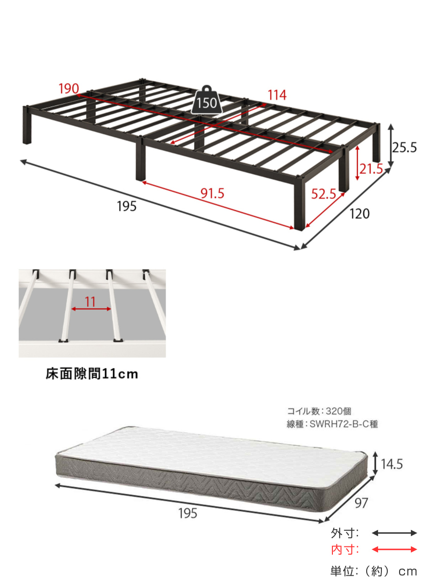 | サイズ | ベッド:約 幅120×奥行195×高さ25.5(cm) マットレス:約 幅97×奥行195×高さ14.5(cm) |