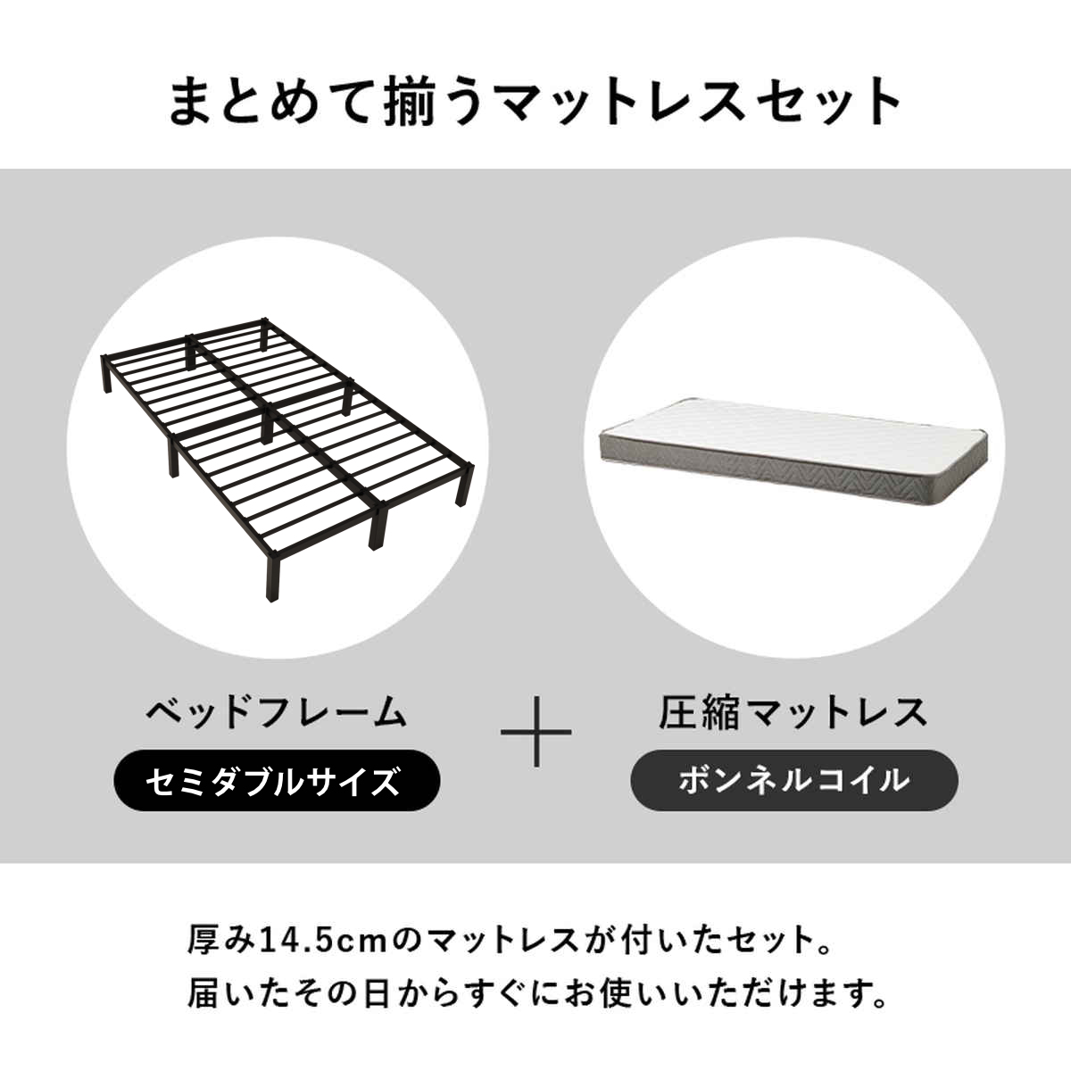 厚み14.5cmのマットレスが付いたセットです。届いたその日から、すぐにお使いいただけます。