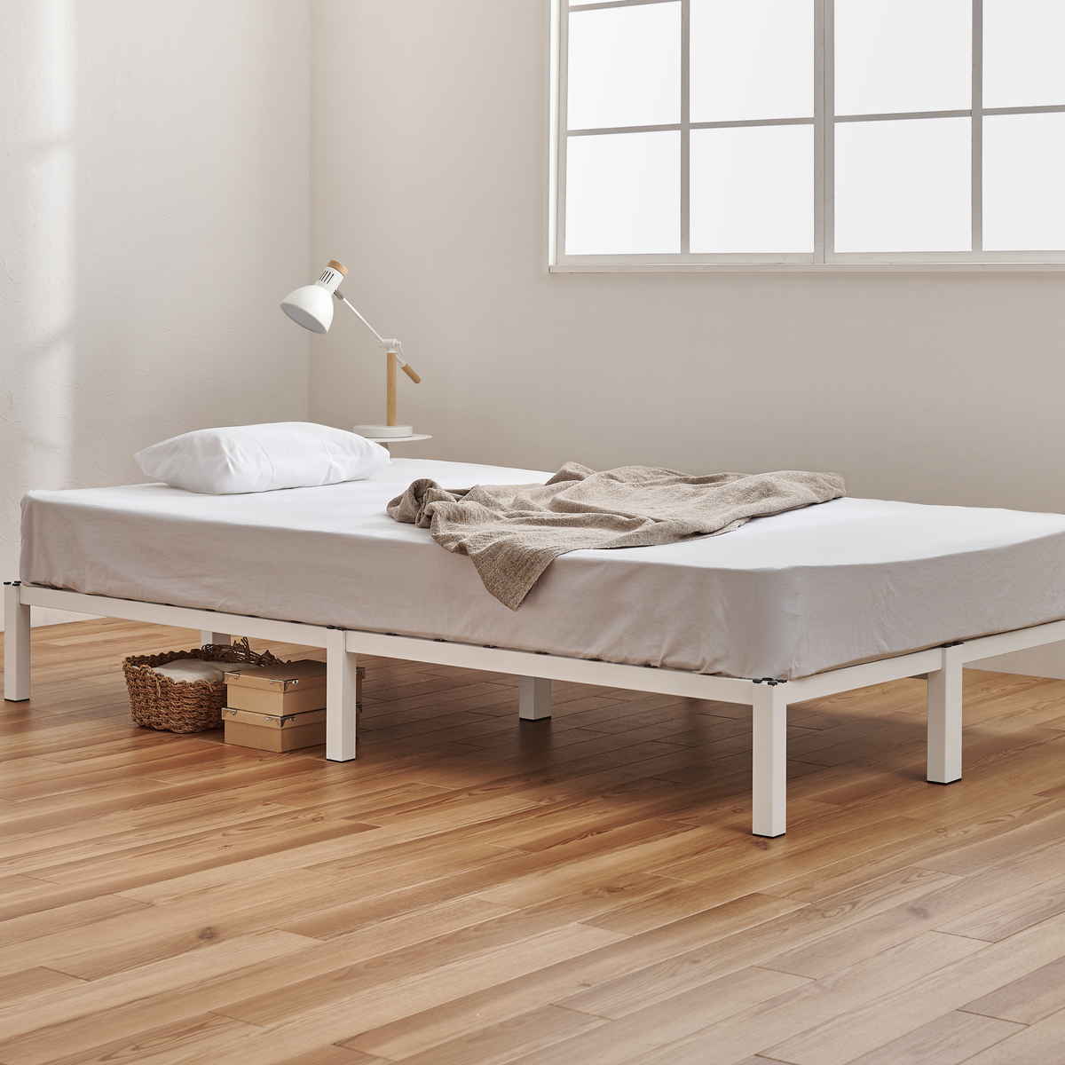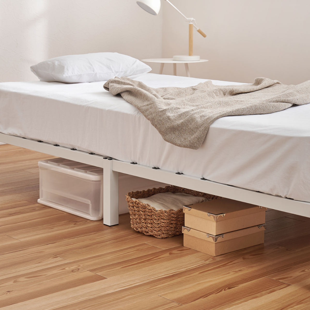 ベッド下は衣装ケースや収納ボックスが置けるスペース。限られた空間でも収納力をしっかり確保できます。