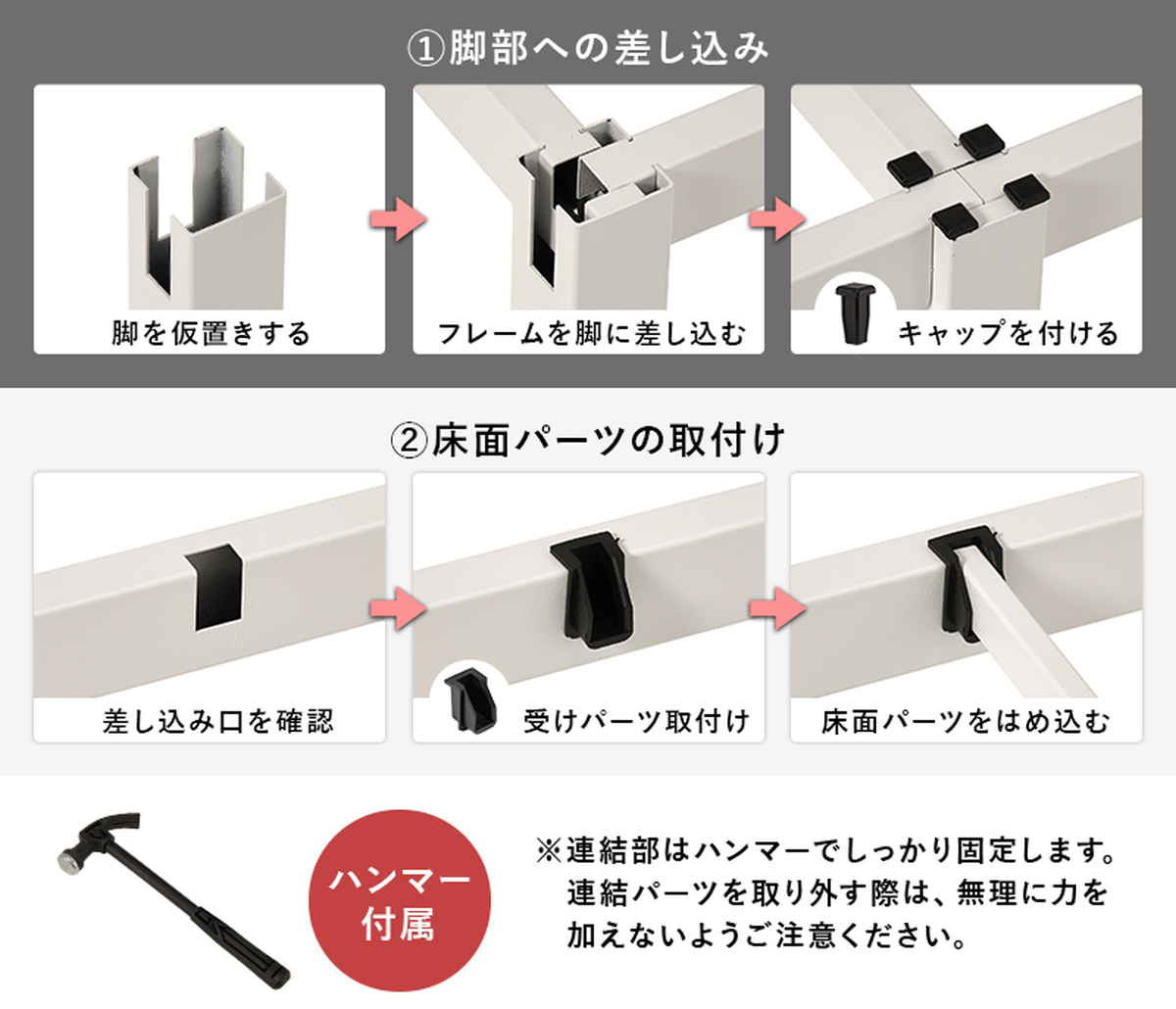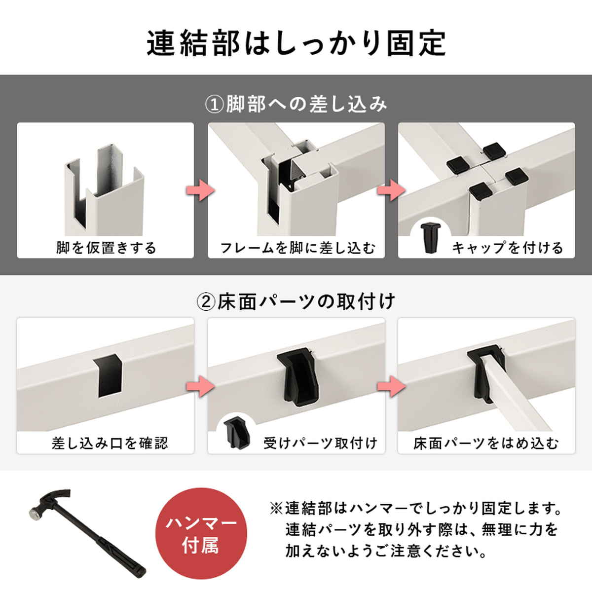連結部は付属のハンマーでしっかり固定。ぐらつきを抑え、安定感のある寝心地を実現します。