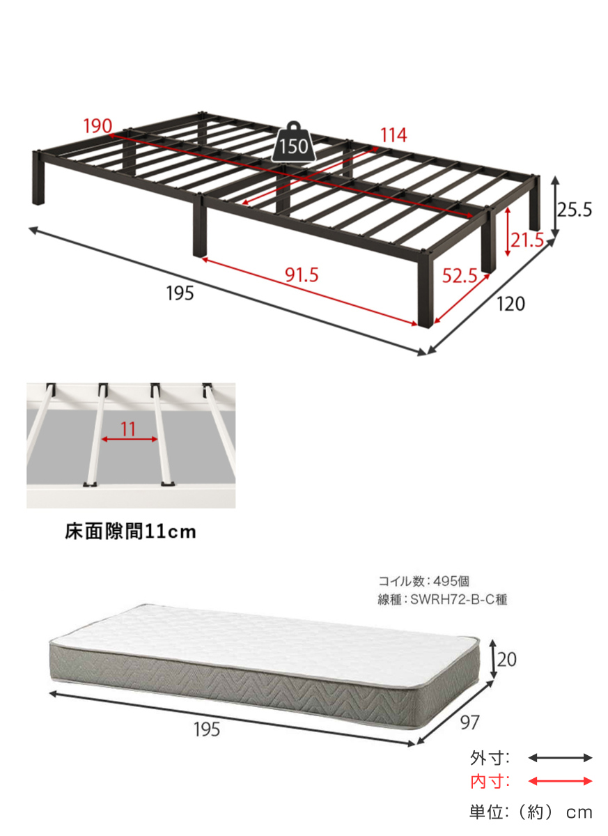 | サイズ | ベッド:約 幅120×奥行195×高さ25.5(cm) マットレス:約 幅97×奥行195×高さ20(cm) |