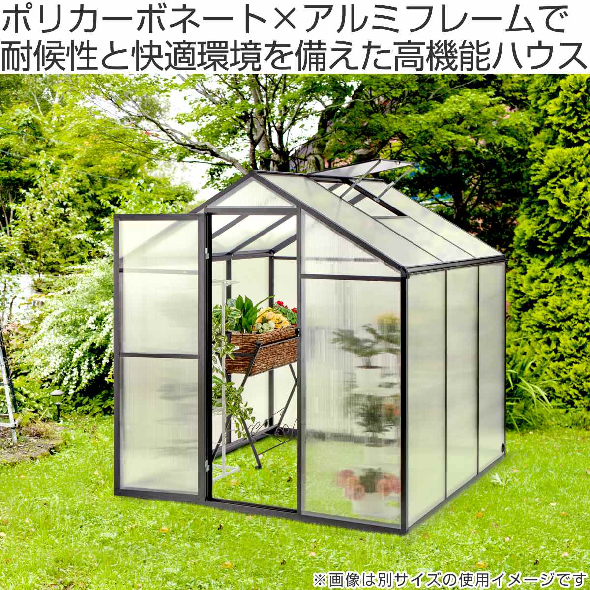 UVカット・耐候・換気機能を備えた、高機能グリーンハウスです。フレームにはアルミニウム合金を採用し、軽量でありながら高い耐久性を実現しています。
