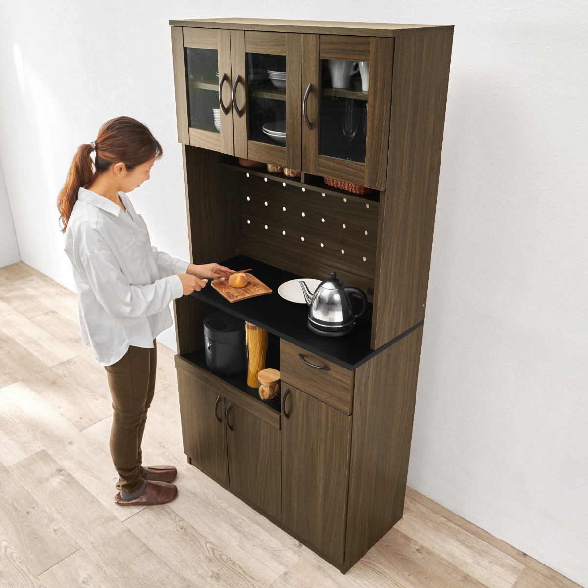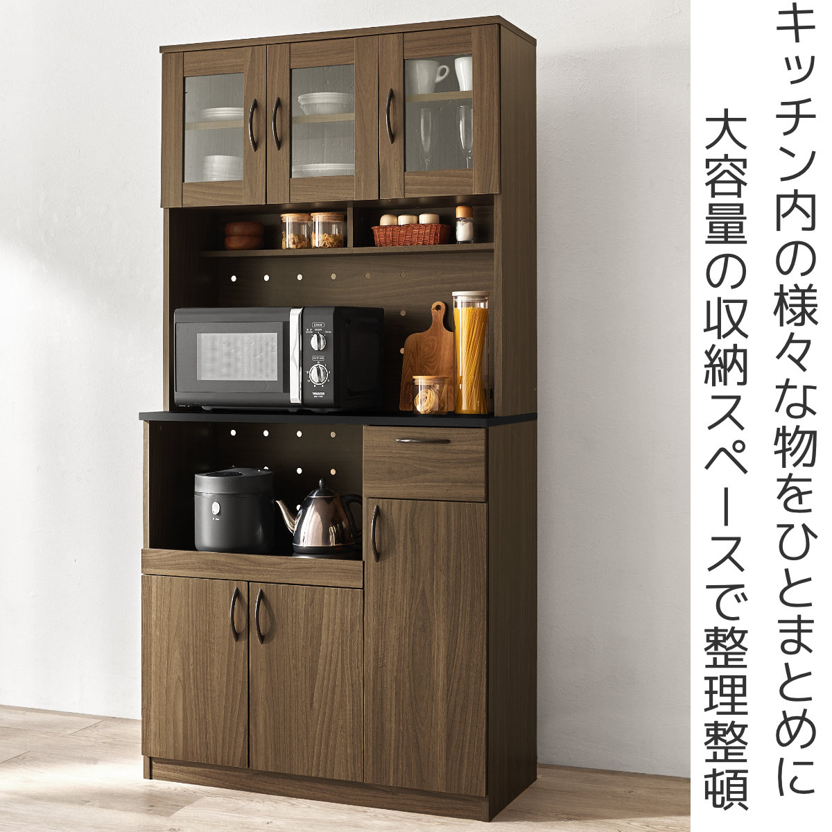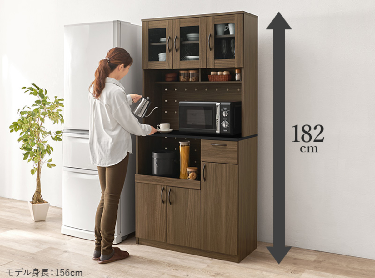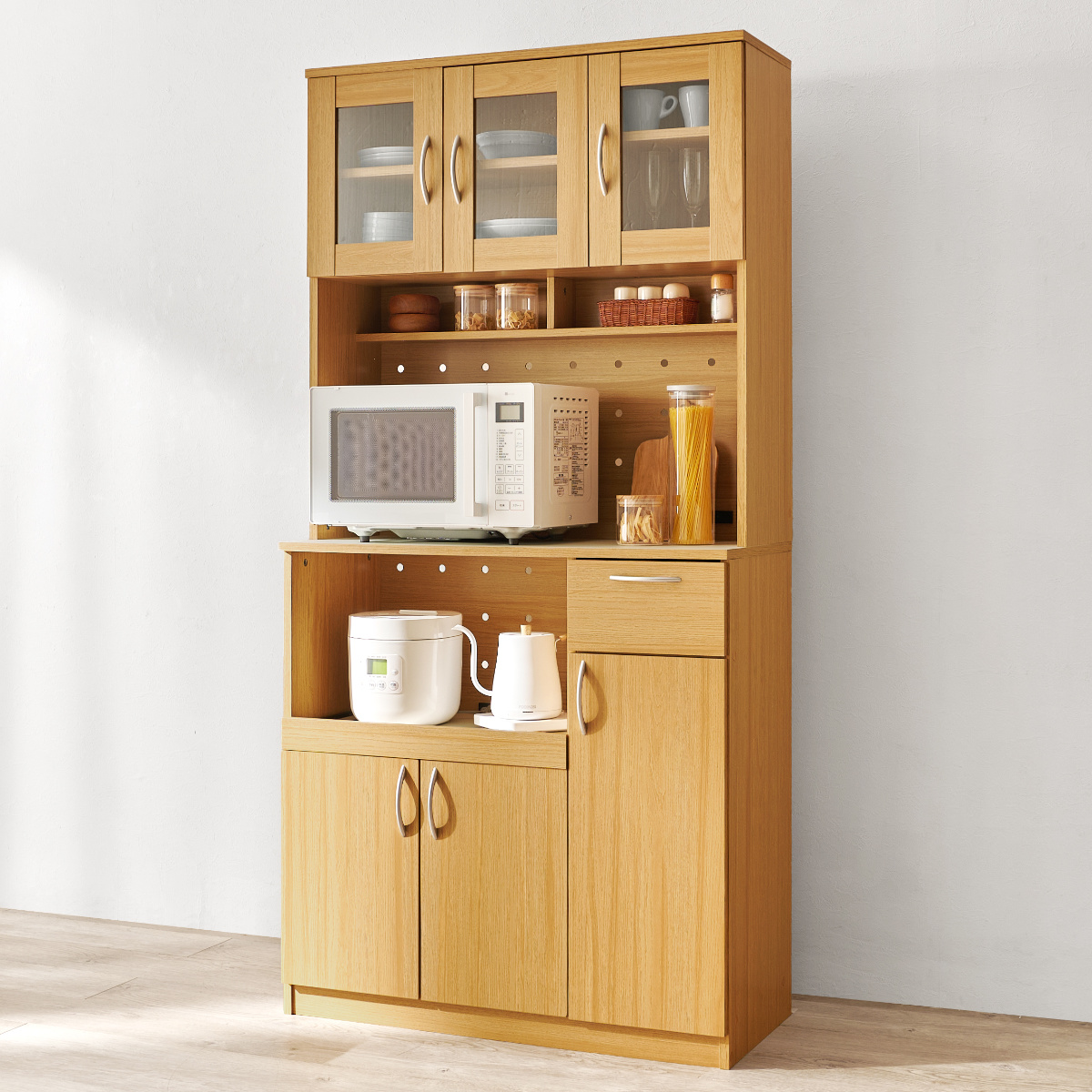 収納スペースが豊富で家電も食器もまとめて収納できる大容量タイプのキッチンボードです。引出しやスライド収納、大きさの違う扉収納などの機能がたくさん。幅89cm高さ182cmのたっぷりサイズで、キッチンがスッキリと片付きます。