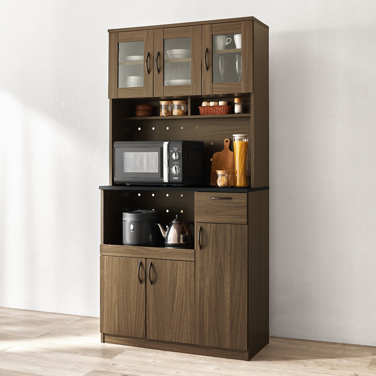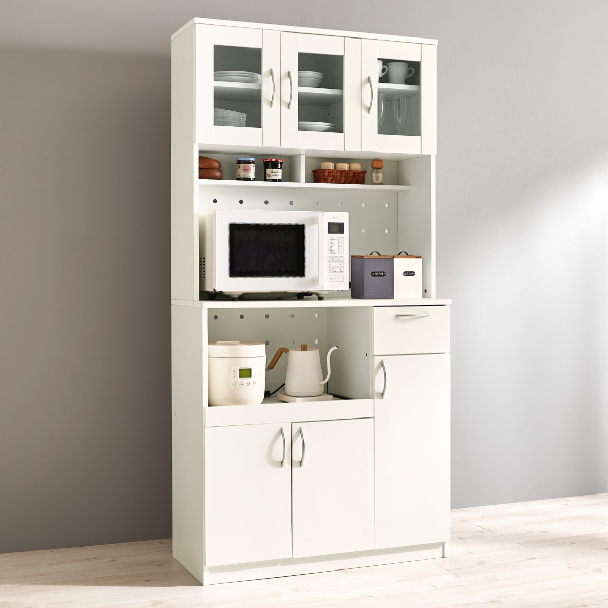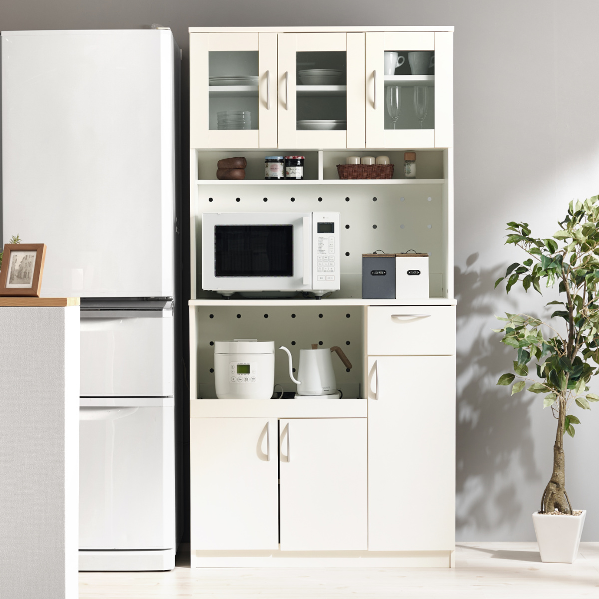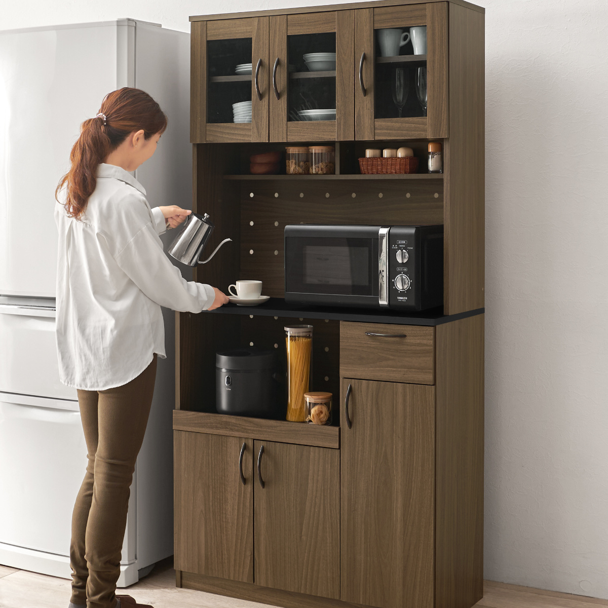 収納スペースが豊富で家電も食器もまとめて収納できる大容量タイプのキッチンボードです。引出しやスライド収納、大きさの違う扉収納などの機能がたくさん。幅89cm高さ182cmのたっぷりサイズで、キッチンがスッキリと片付きます。